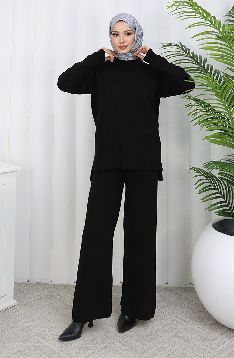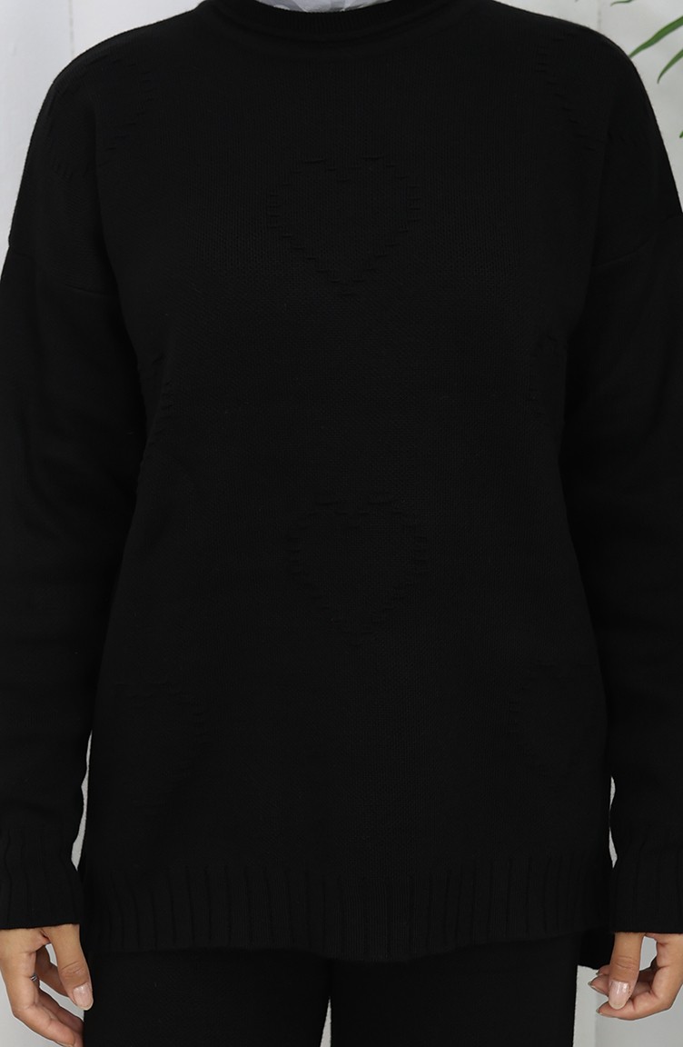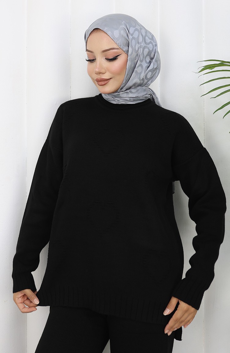 Knitwear Heart Patterned Sweater Trousers Two Piece Set 0016-04 Black 0016-04