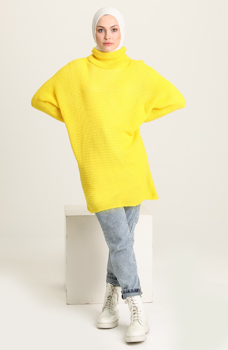 Yellow color is used. Knitwear is an indispensable type of fabric for the winter months. It has a plain appearance. The product is used unlined. It has batwing sleeve. Made as a Polo neck. Designed from thick fabric. Plus size option available.