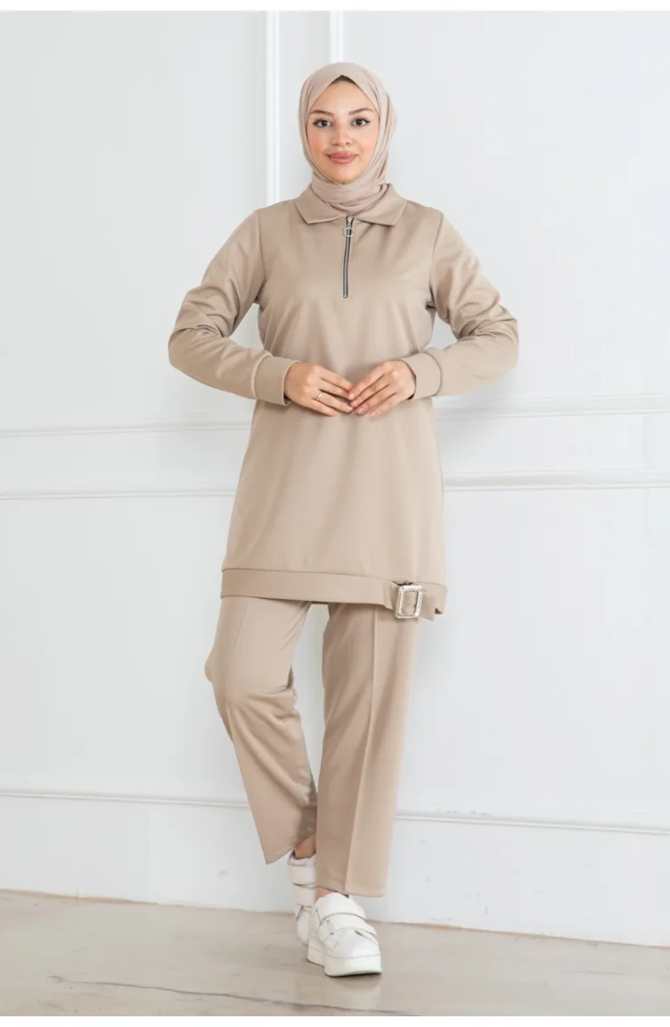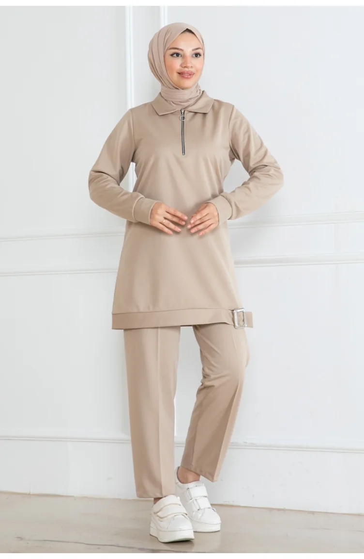 Half Zipper Hijab Suit 1099-02 Beige 1099-02
