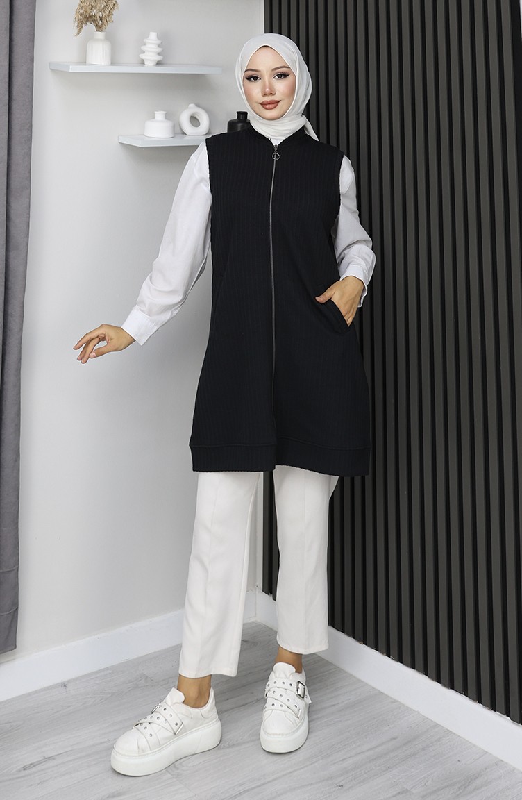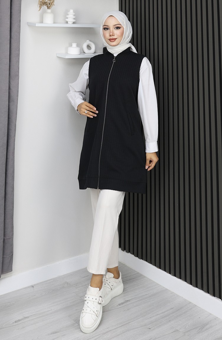 Black color is used. In winter, quilted models are in first place. Designed with a striped fabric. Zipper is used for easy handling. It's a sleeveless product. Suitable for 4 seasons. The size worn by the model, is the one on the image.
