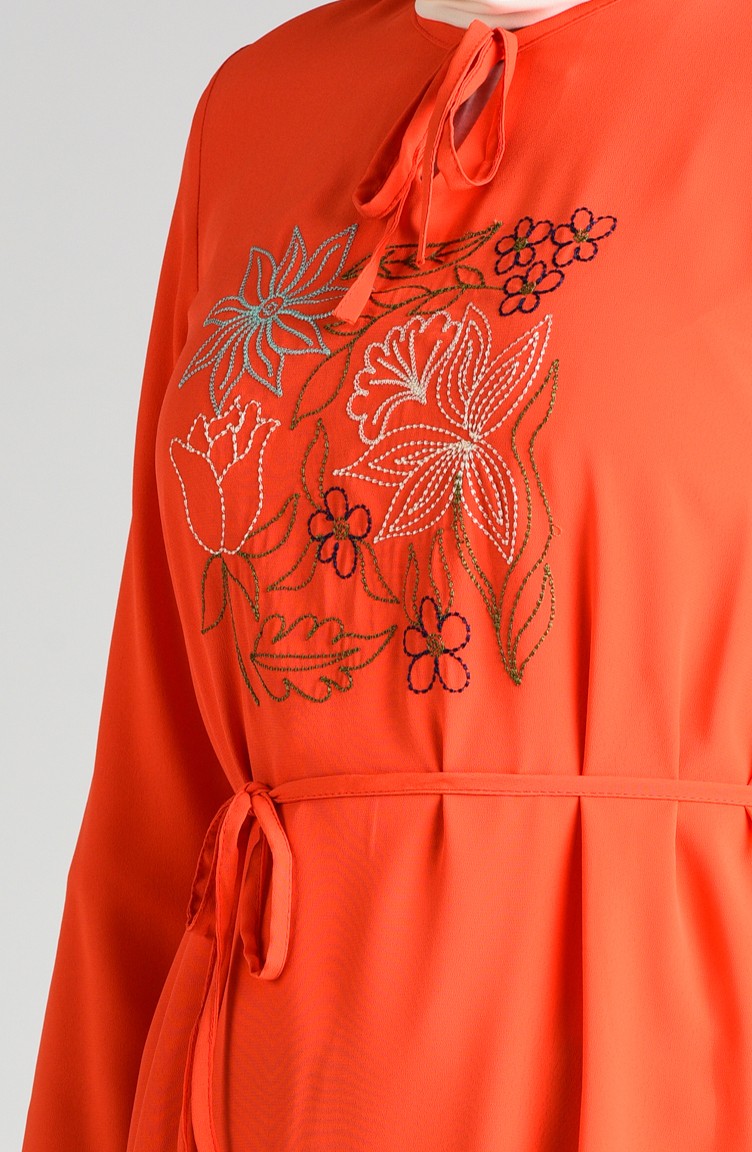 Vermilion. Viscose is a type of synthetic fabric and is convenient to use. It has an handiwork design. The product is used unlined. Long sleeve product. The Zero collar is preferred for all types of clothing. Designed for summer use. The size worn by the model, is the one on the image.