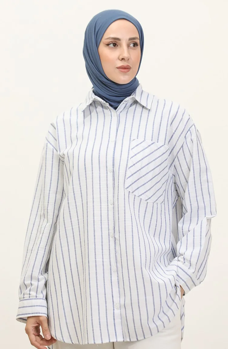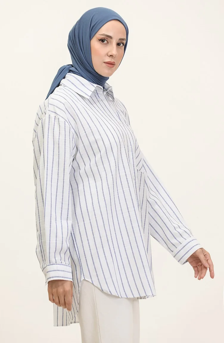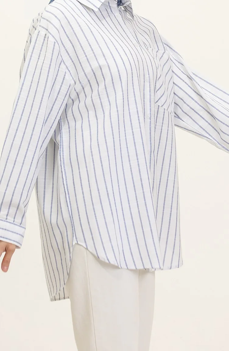 Indigo color is used. The cotton fabric has an absorbent texture. Designed with a striped fabric. The product is used unlined. Long sleeve product. Suitable for 4 seasons. Plus size option available.