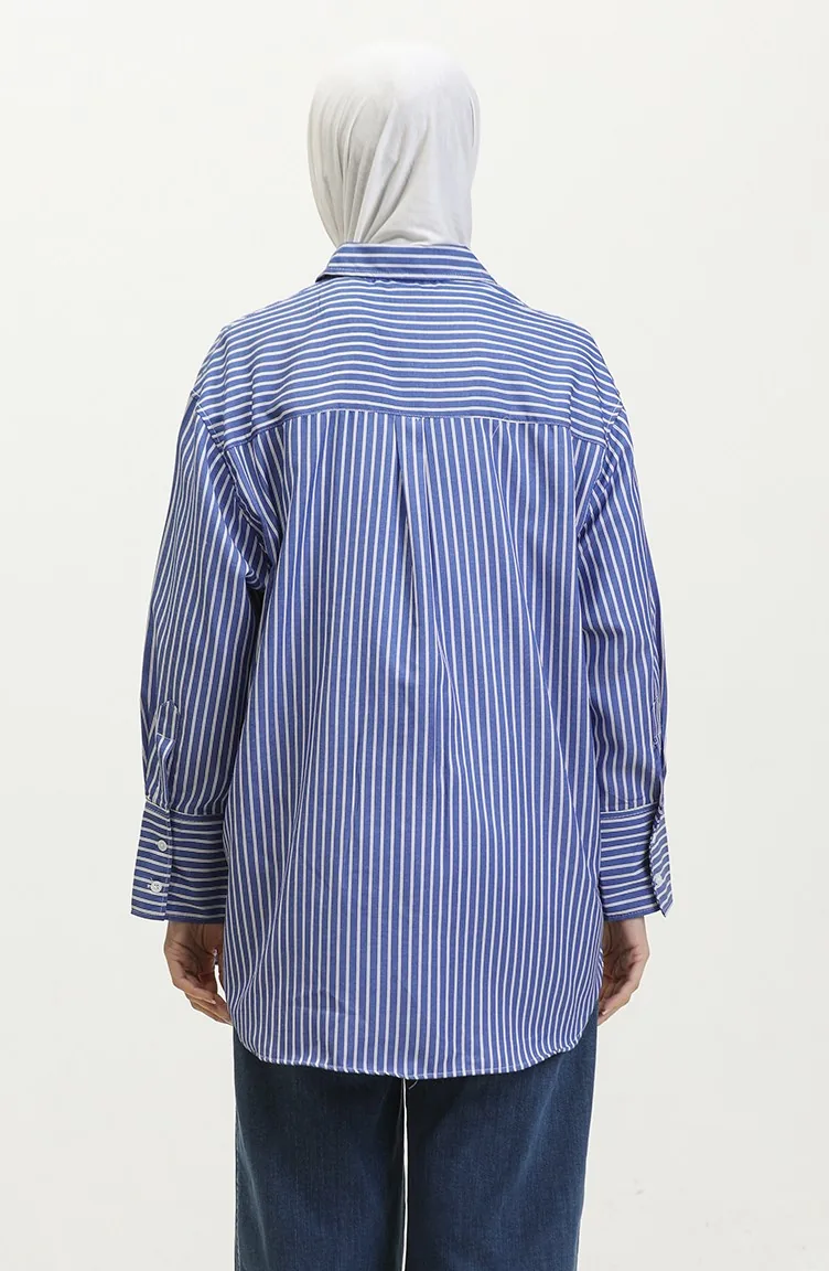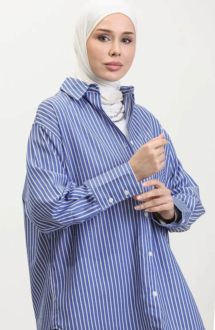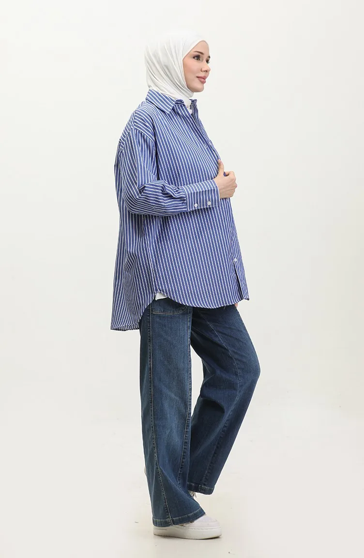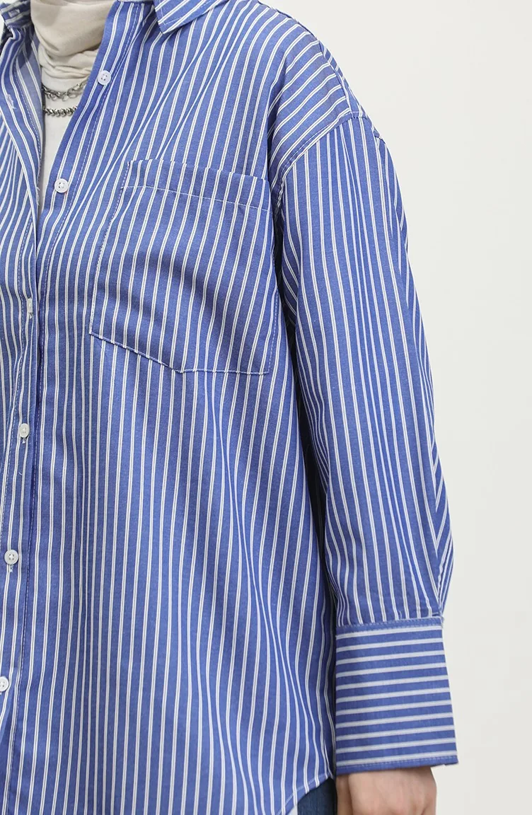 Saxon blue color is used. The cotton fabric has an absorbent texture. Designed with a striped fabric. The product is used unlined. Long sleeve product. Suitable for 4 seasons. Plus size option available.
