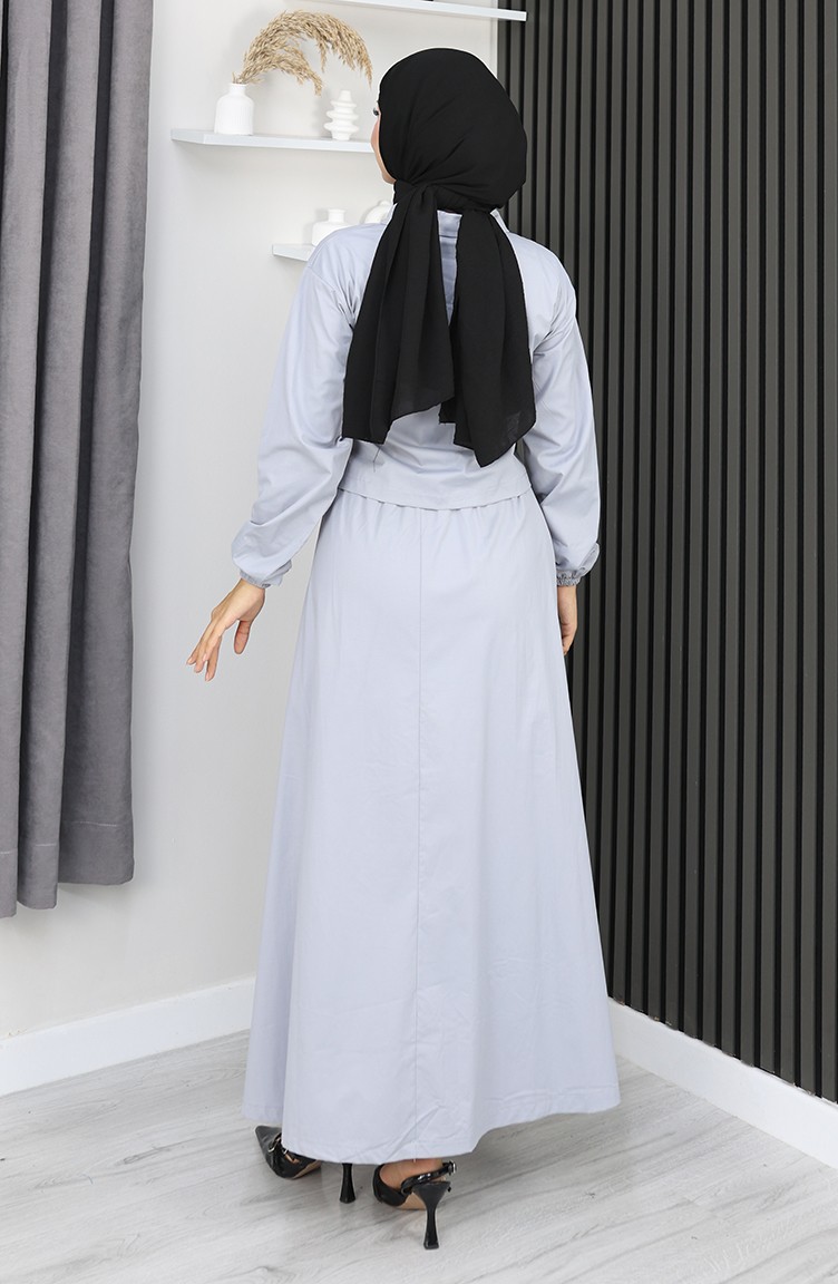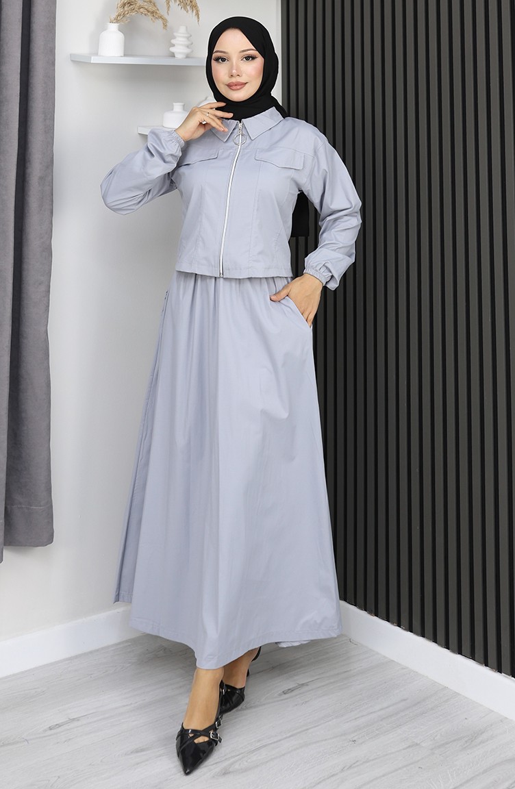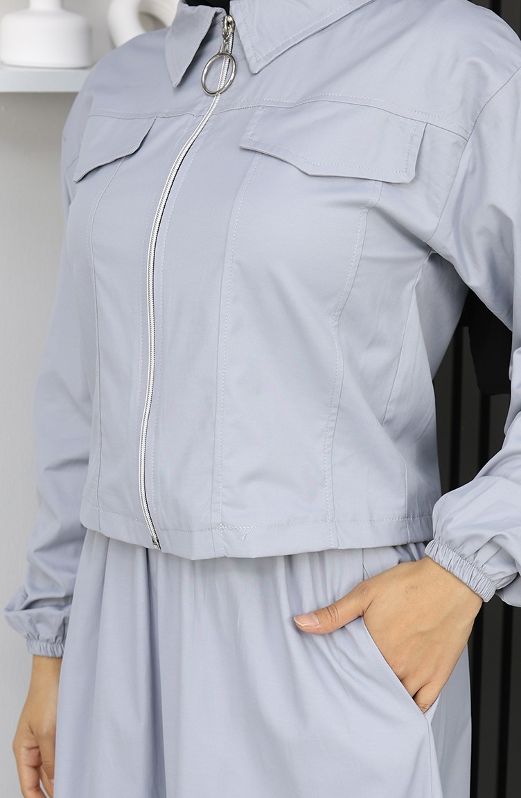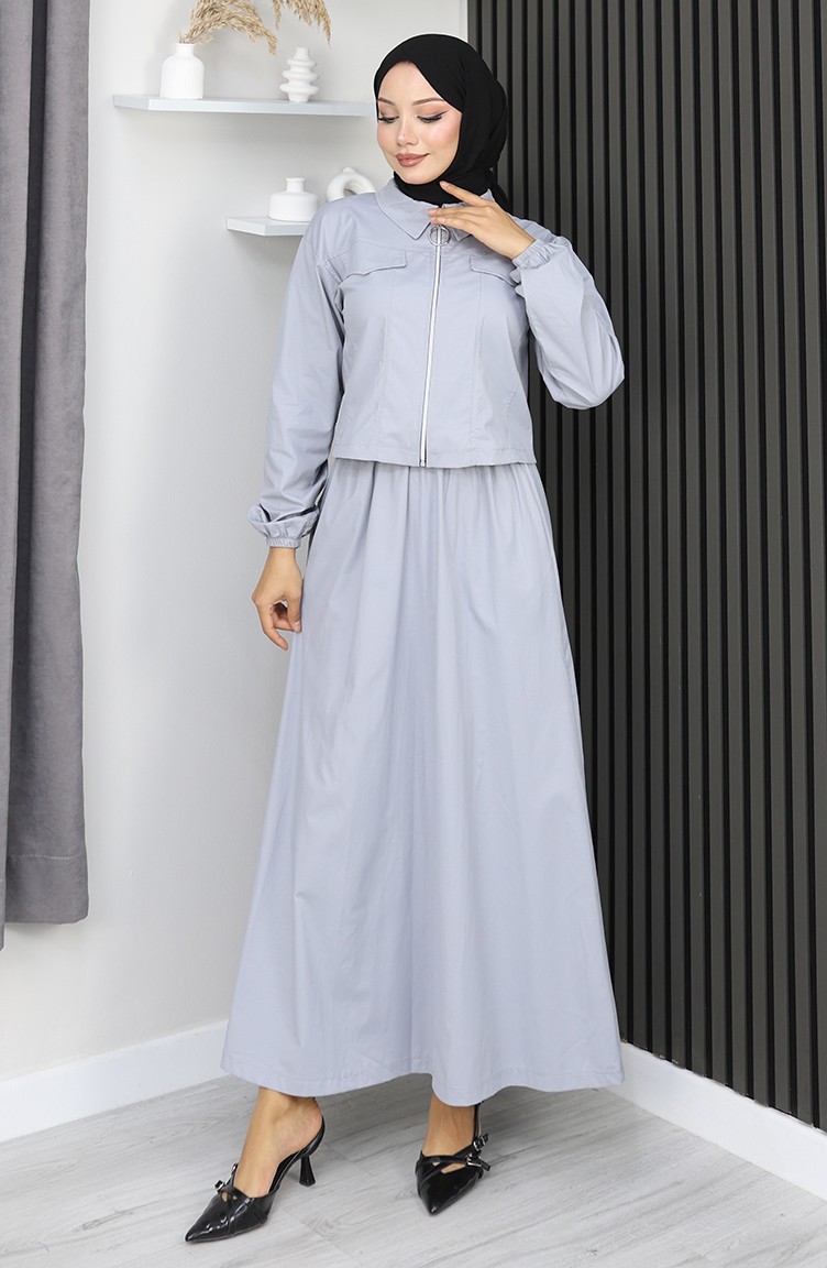 Gray color is used. The cotton fabric has an absorbent texture. It has a plain appearance. Zipper is used for easy handling. It's made of elastic sleeves. Suitable for 4 seasons. The size worn by the model, is the one on the image.