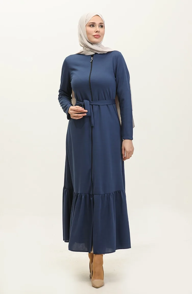 Shirred Hem Belted Abaya 0703-08 İndigo 0703-08