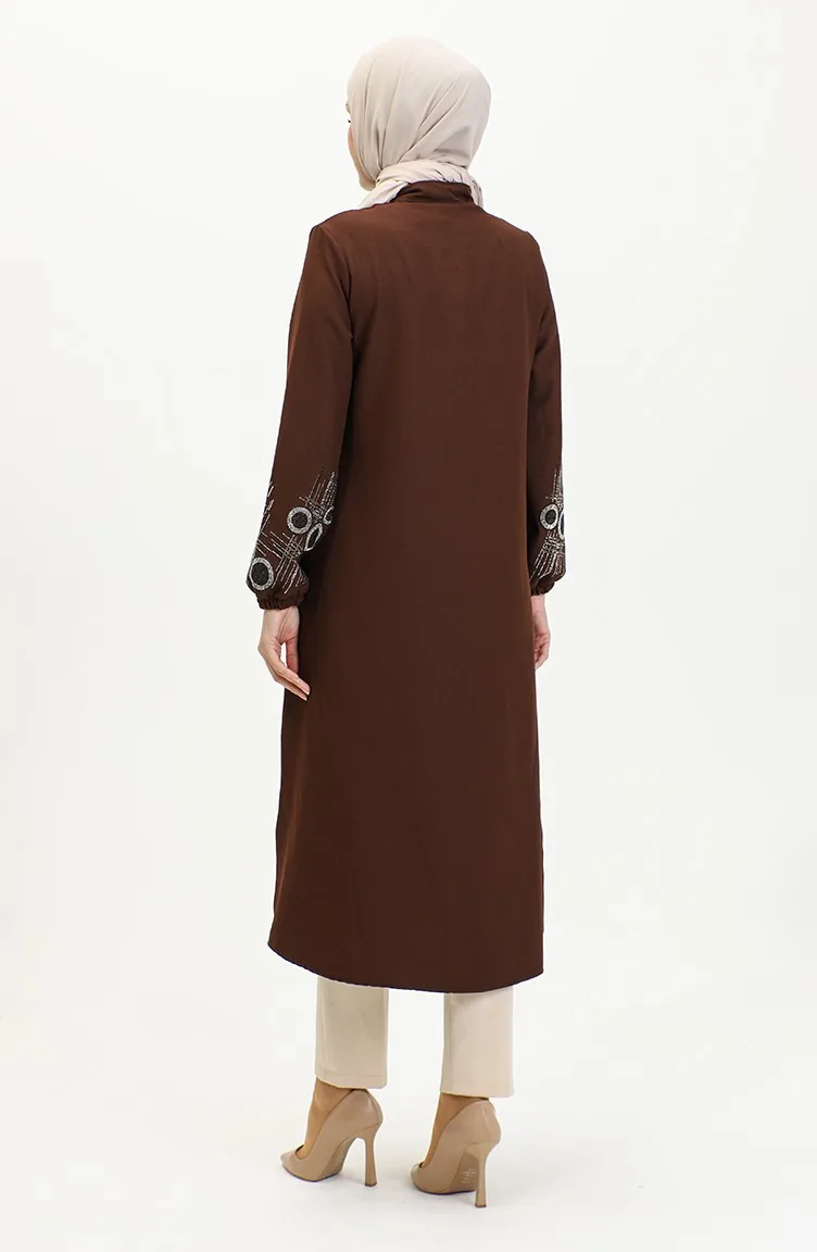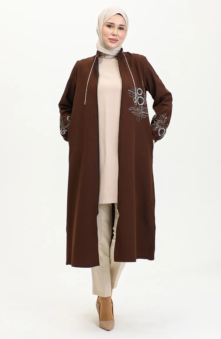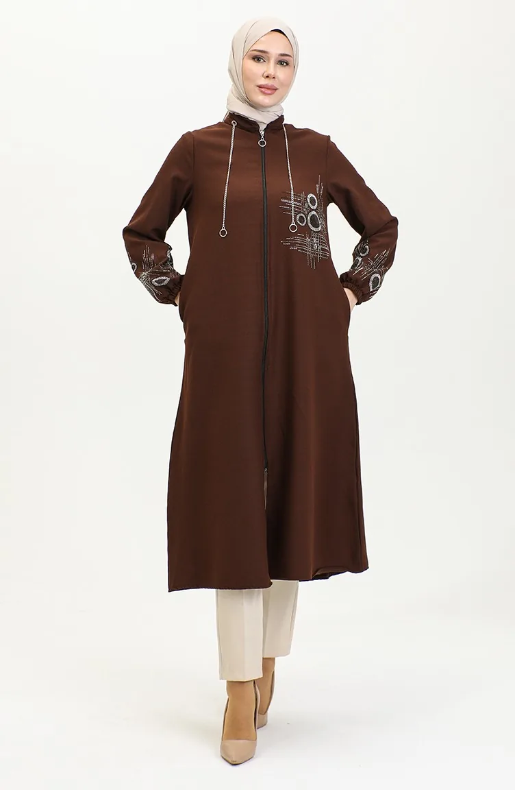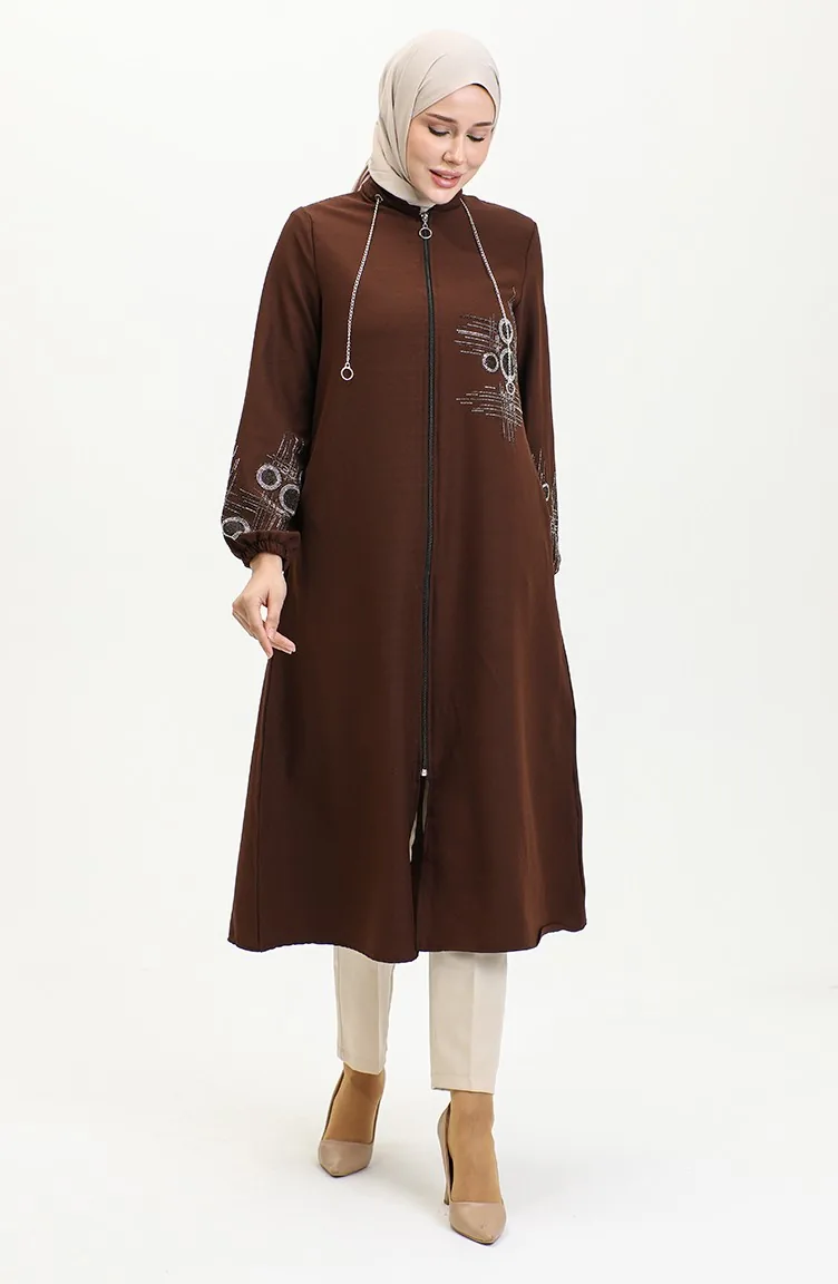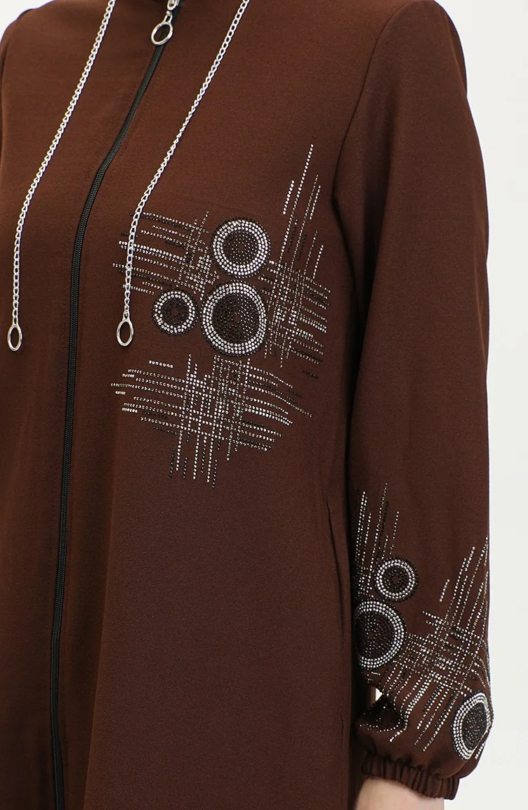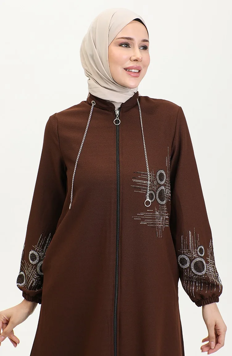 Stone Printed Zippered Abaya 0411-03 Brown 0411-03
