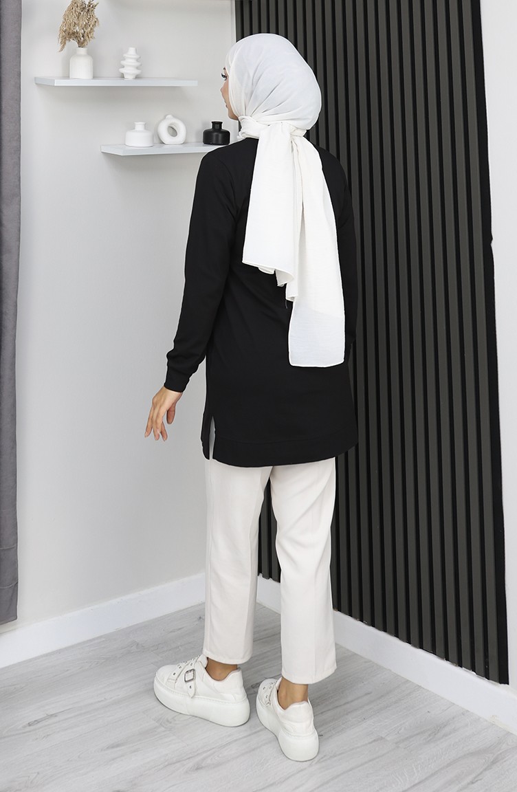 Black color is used. The cotton fabric has an absorbent texture. It has a plain appearance. When the tunic combined with another product, you will get a nice suit. The Zero collar is preferred for all types of clothing. Suitable for 4 seasons. The size worn by the model, is the one on the image.