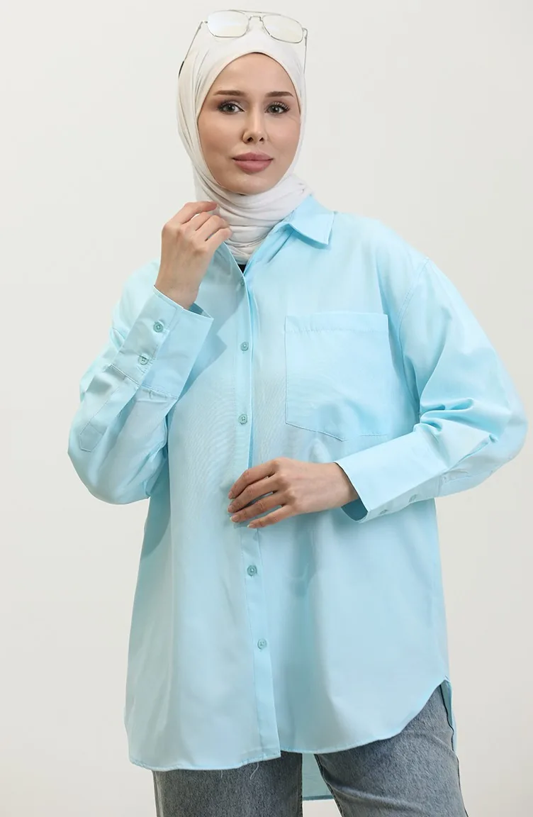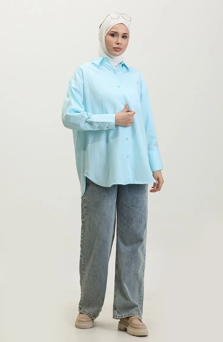 Turquoise color used. The cotton fabric has an absorbent texture. It has a plain appearance. The product is used unlined. Long sleeve product. Suitable for 4 seasons. Plus size option available.