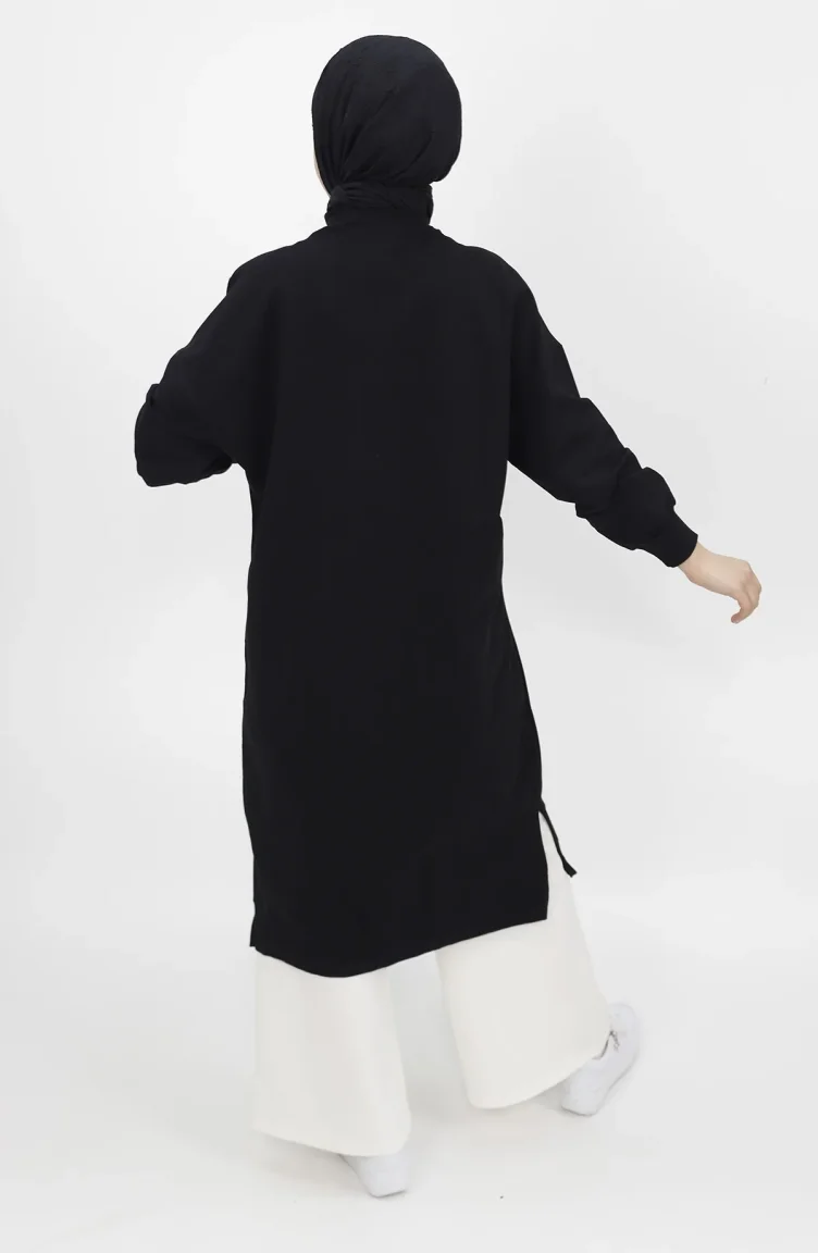 Black color is used. It has a plain appearance. Long sleeve product. The Zero collar is preferred for all types of clothing. Designed for summer use. Woman. The size worn by the model, is the one on the image.