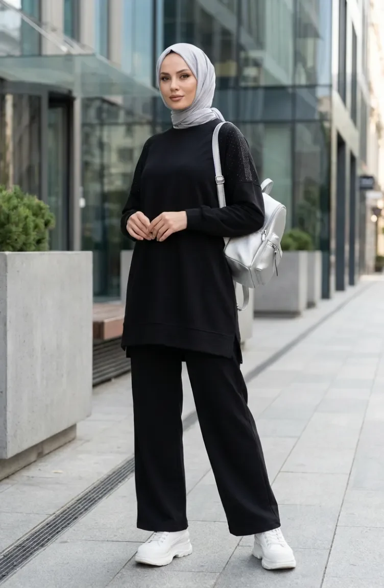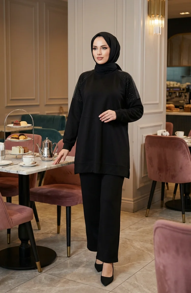 Black color is used. Oysho. It has a plain appearance. When the tunic combined with another product, you will get a nice suit. The Zero collar is preferred for all types of clothing. Suitable for 4 seasons. The size worn by the model, is the one on the image.