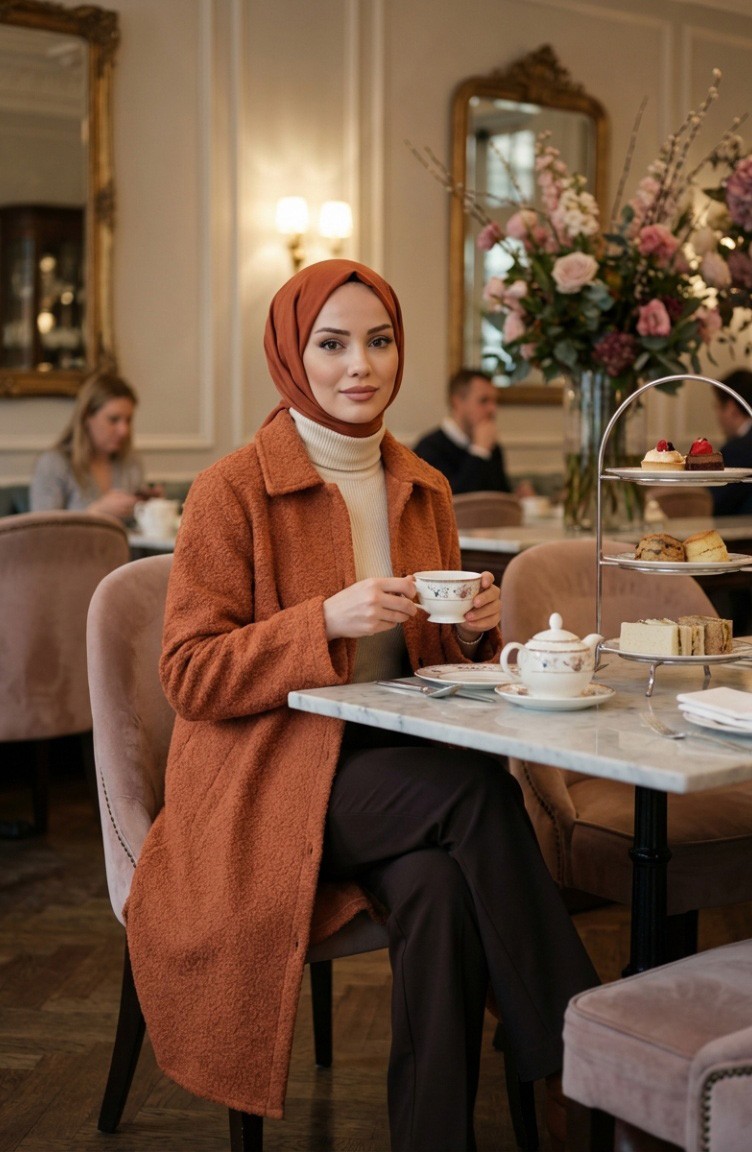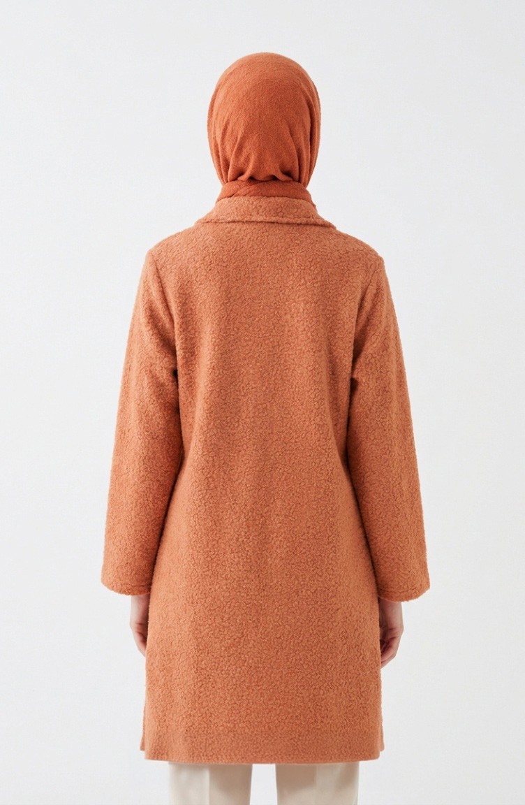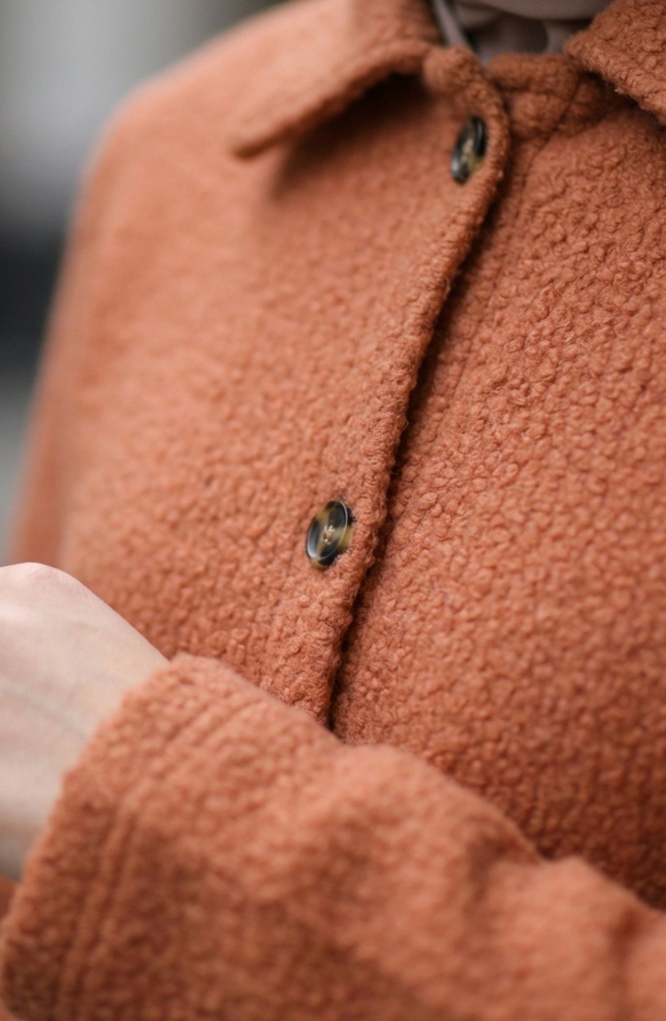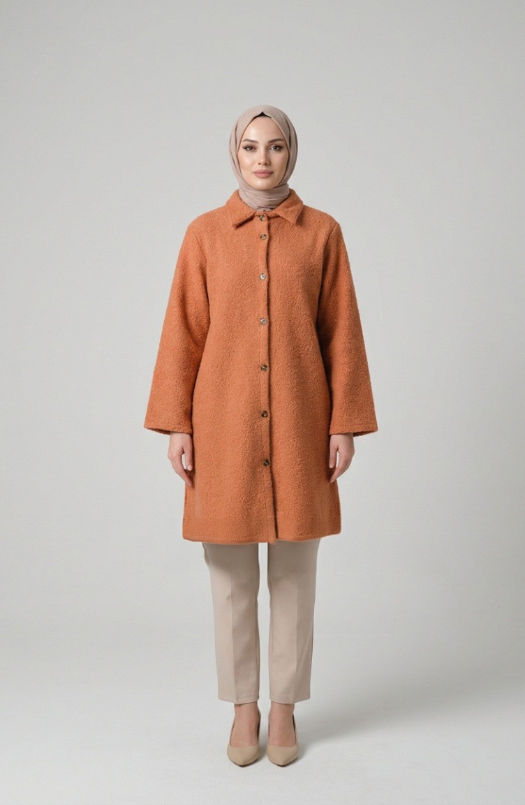 Pale Orange color is used. Bouclé has used. It has a plain appearance. Buttons have been used to make it easy to use. Designed from thick fabric. The size worn by the model, is the one on the image.