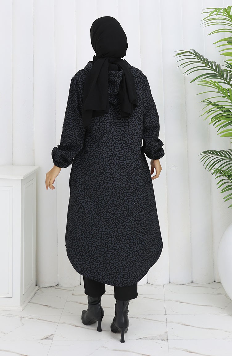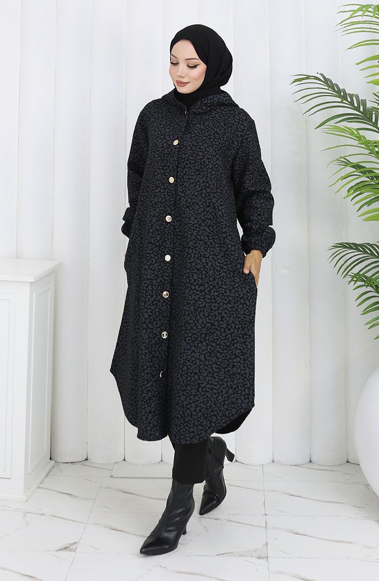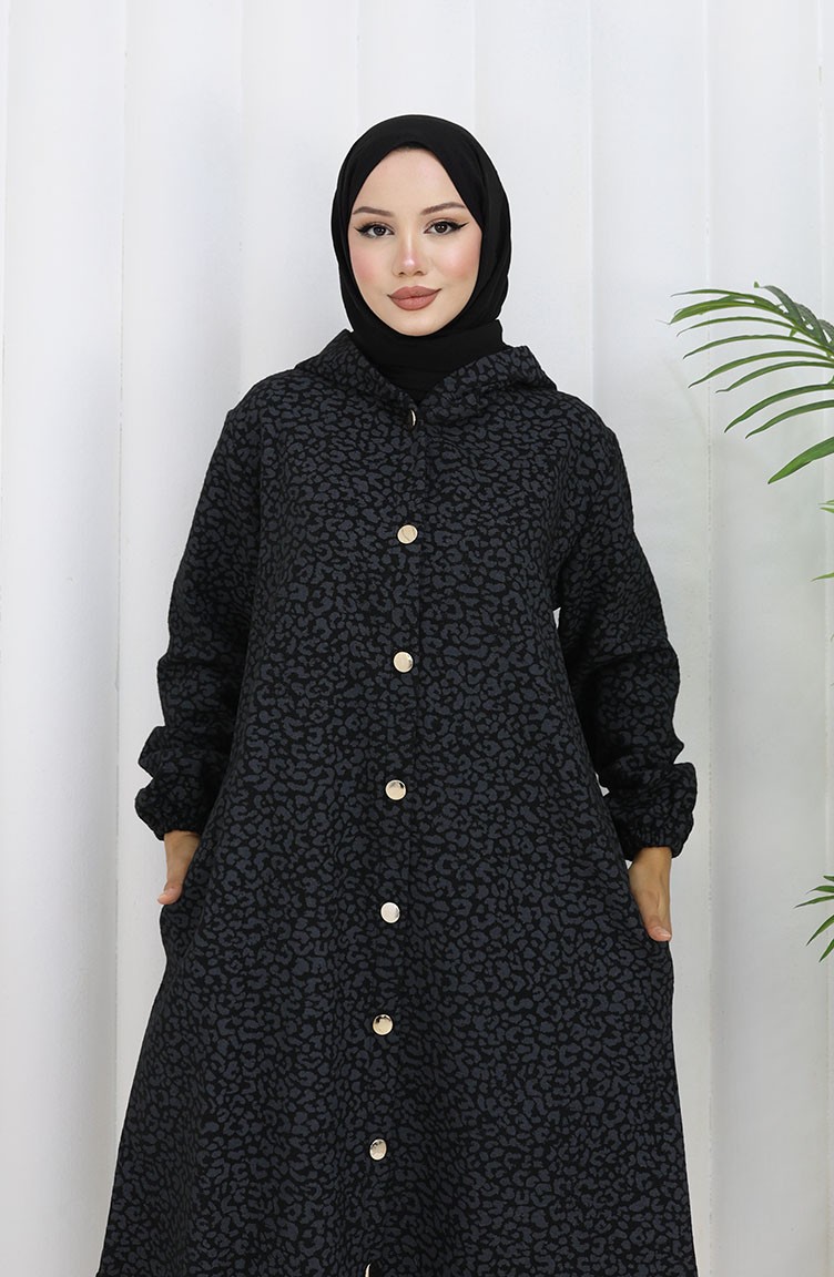 Leopard Pattern Hooded Cashmere Coat 0187-01 Black Gray 0187-01