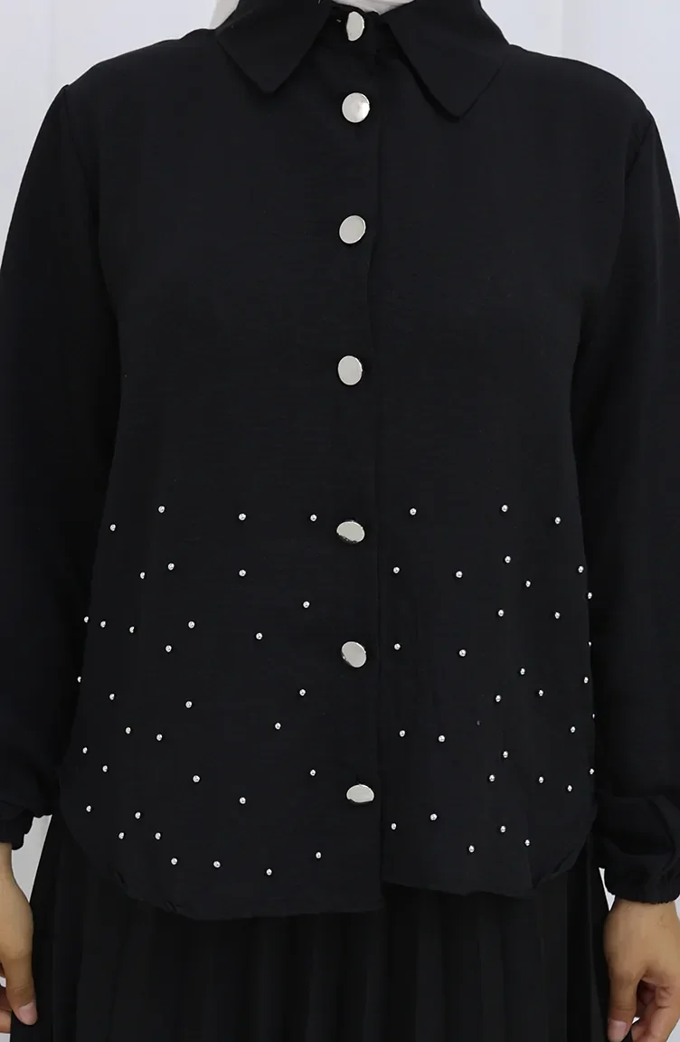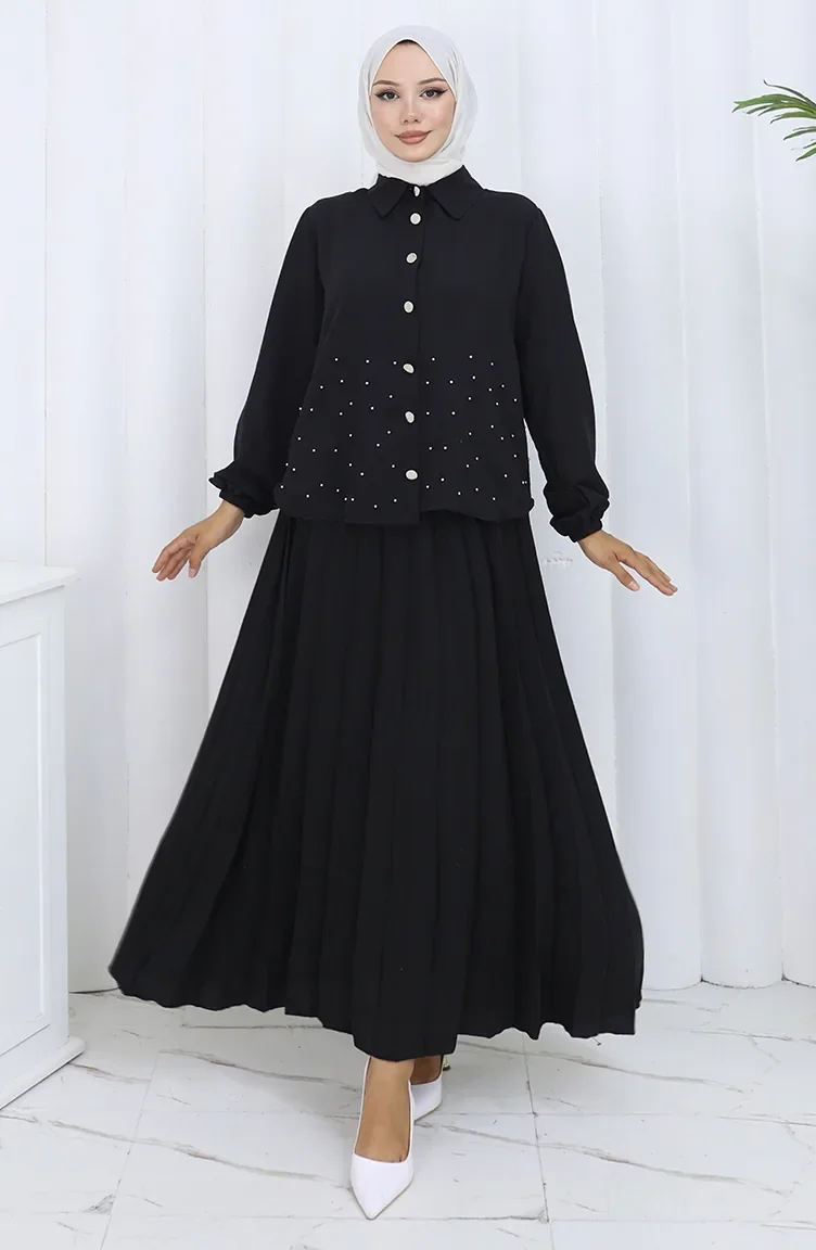 Taşlı Düğmeli Tunik Etek İkili Takım 2115-05 Siyah