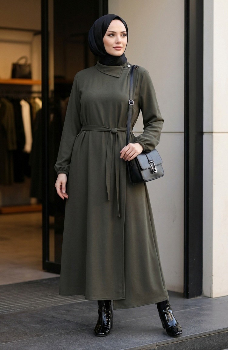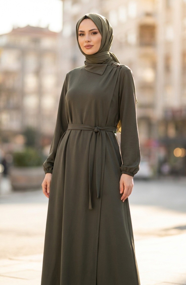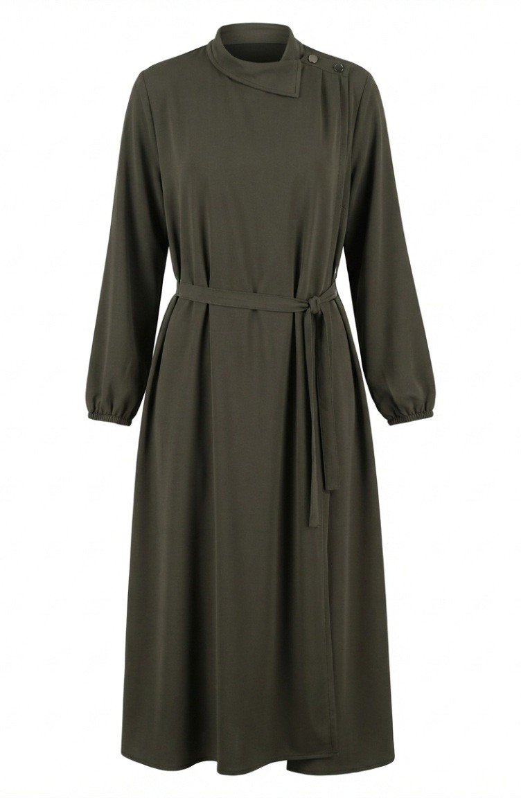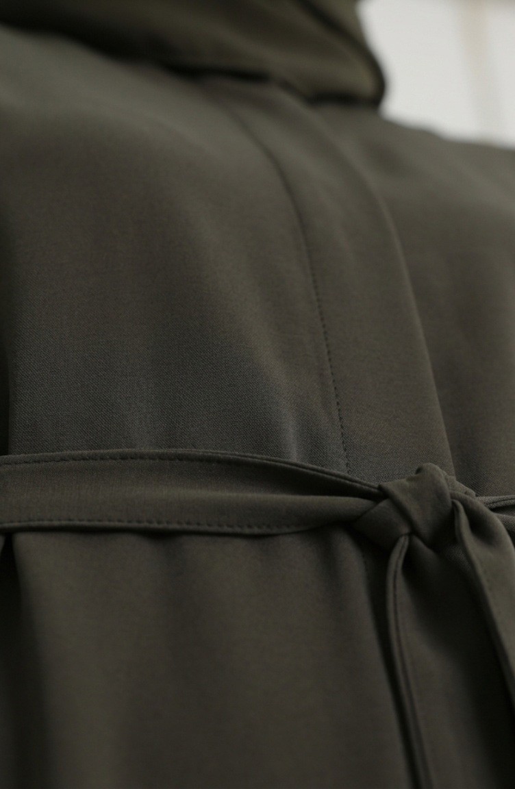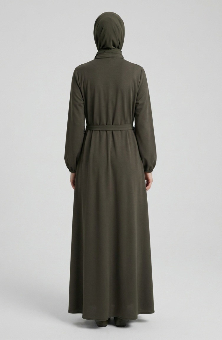 Abaya Kaki 2212-01 Manches élastiquées Et Ceinture Ornée De Boutons 2212-01