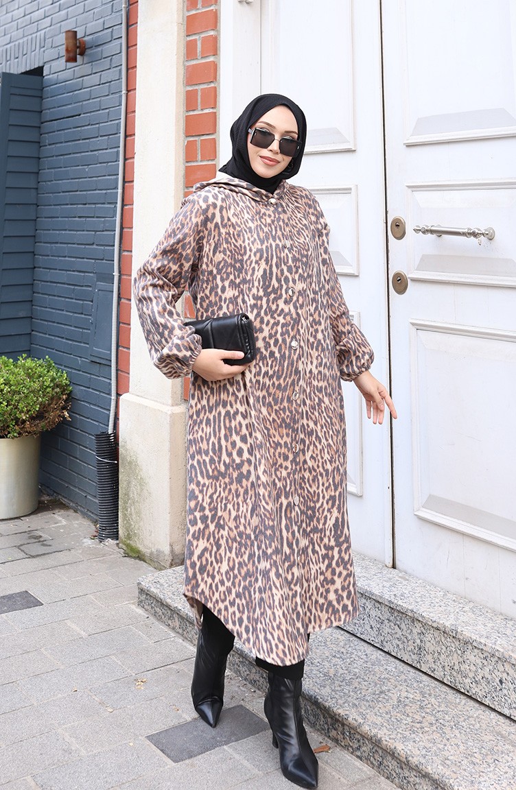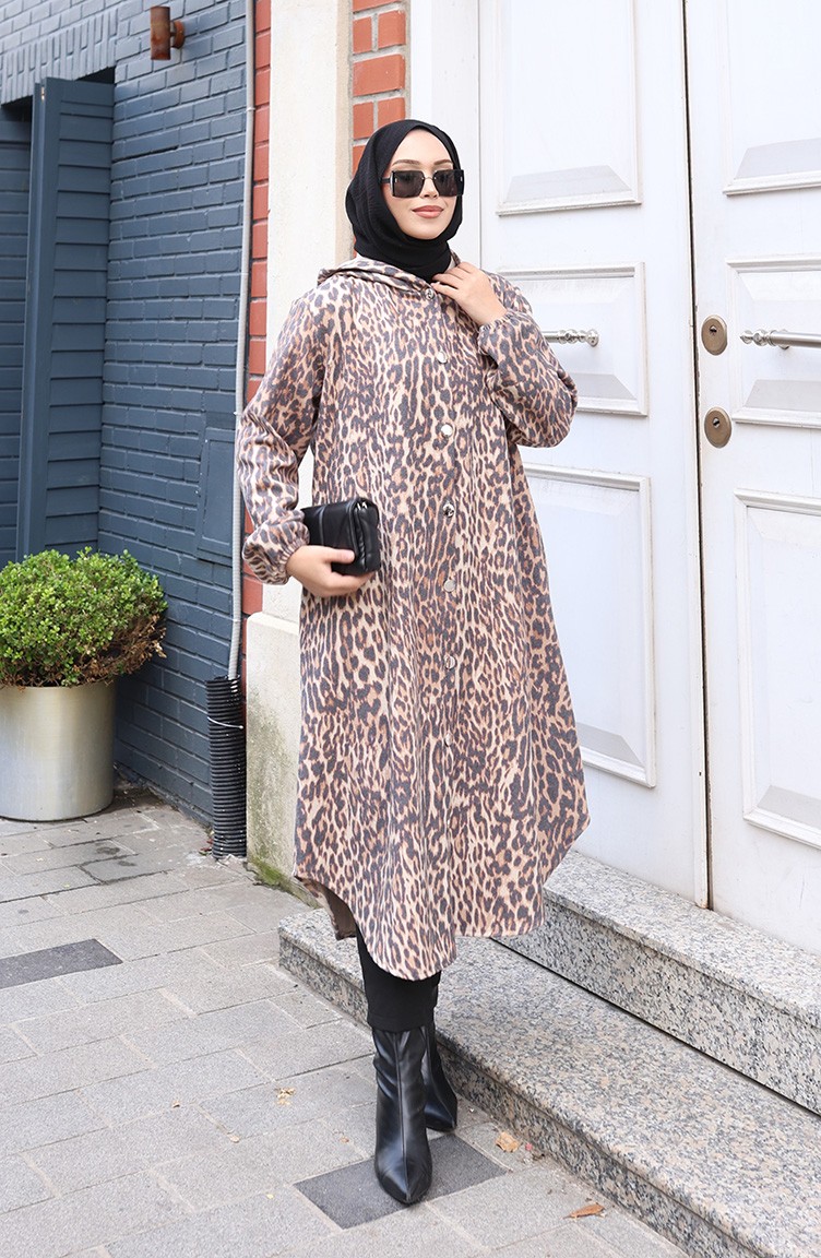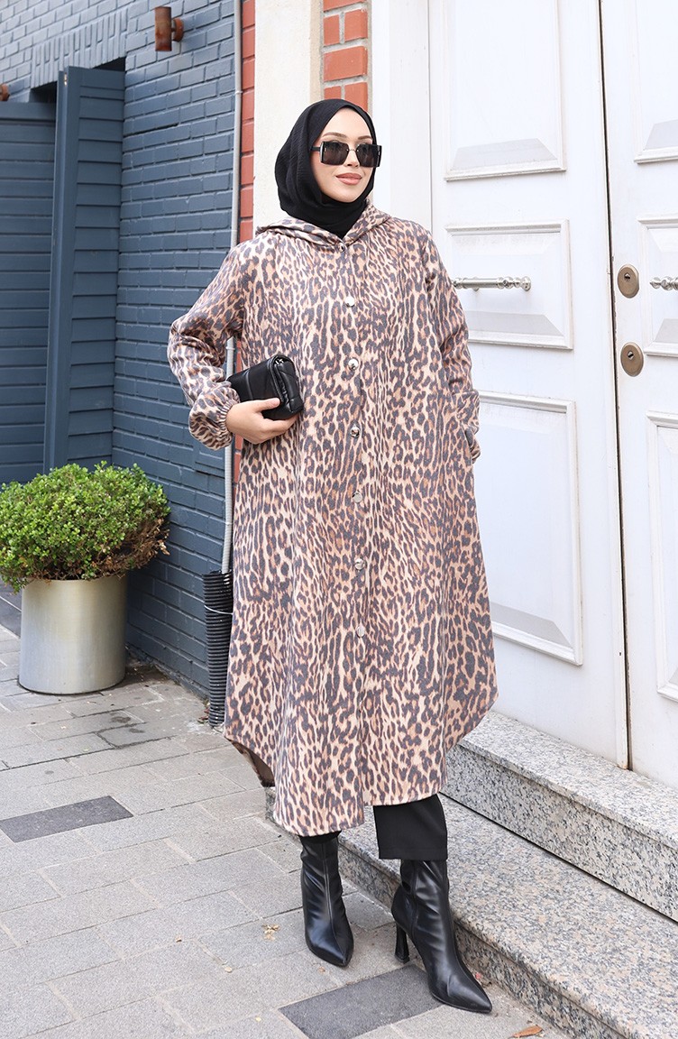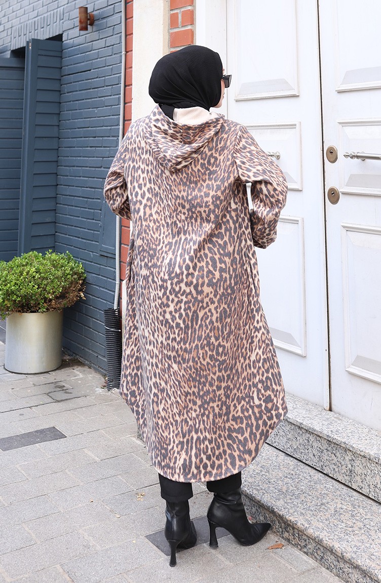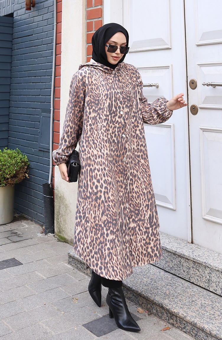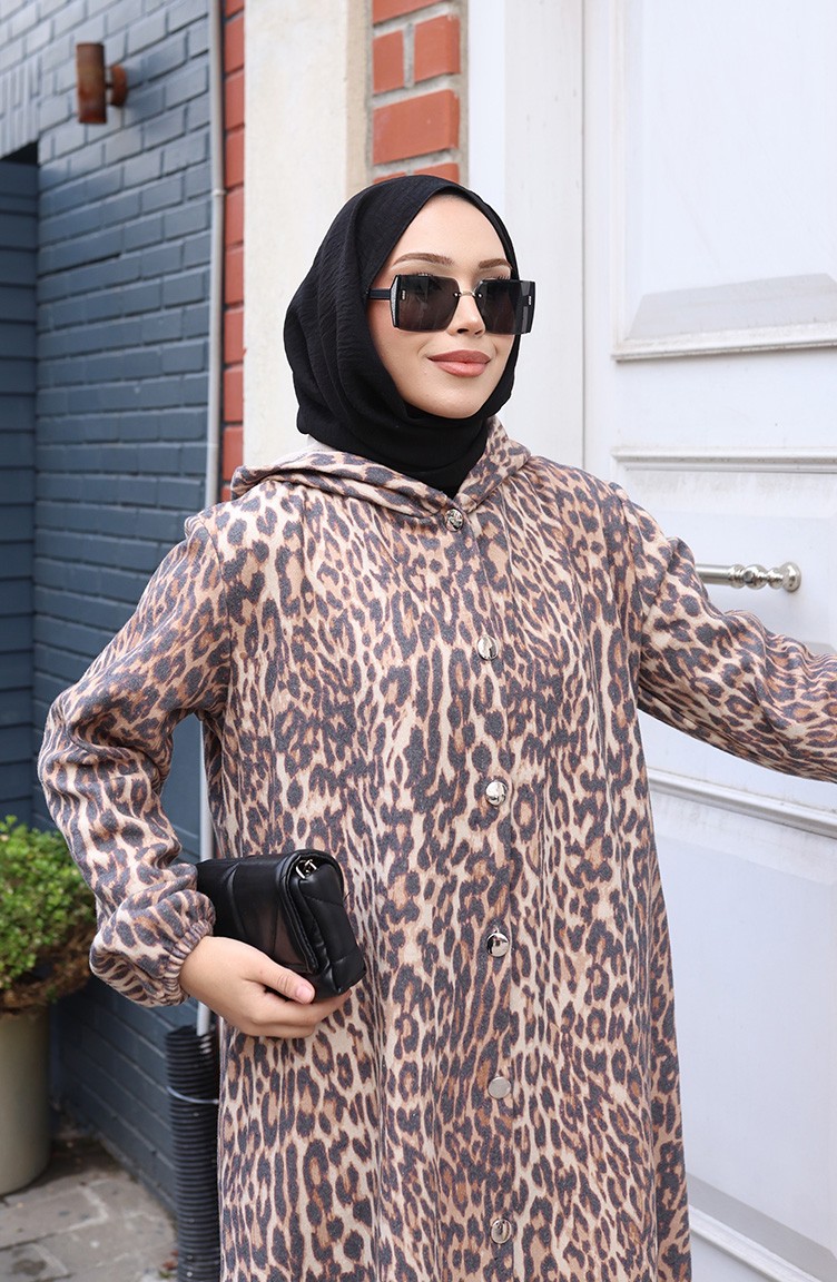 Manteau En Cachemire à Capuche Et Boutons Motif Léopard Couleur Café Au Lait Anthracite 0226-03 0226-03