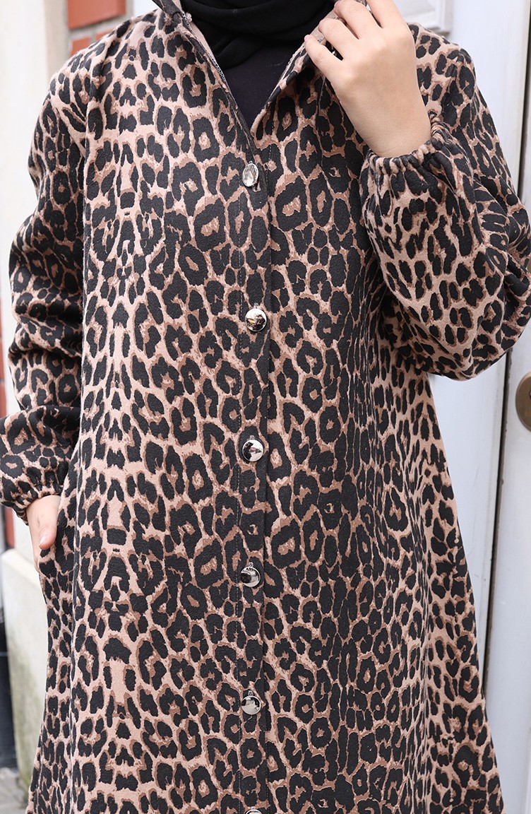 Couleur Noire. C'est un tissu molleton, vous pouvez l'utiliser facilement en hiver. Motif Léopard. Avec boutons. Manches élastiques. Hivernal. Option de grande taille disponible.