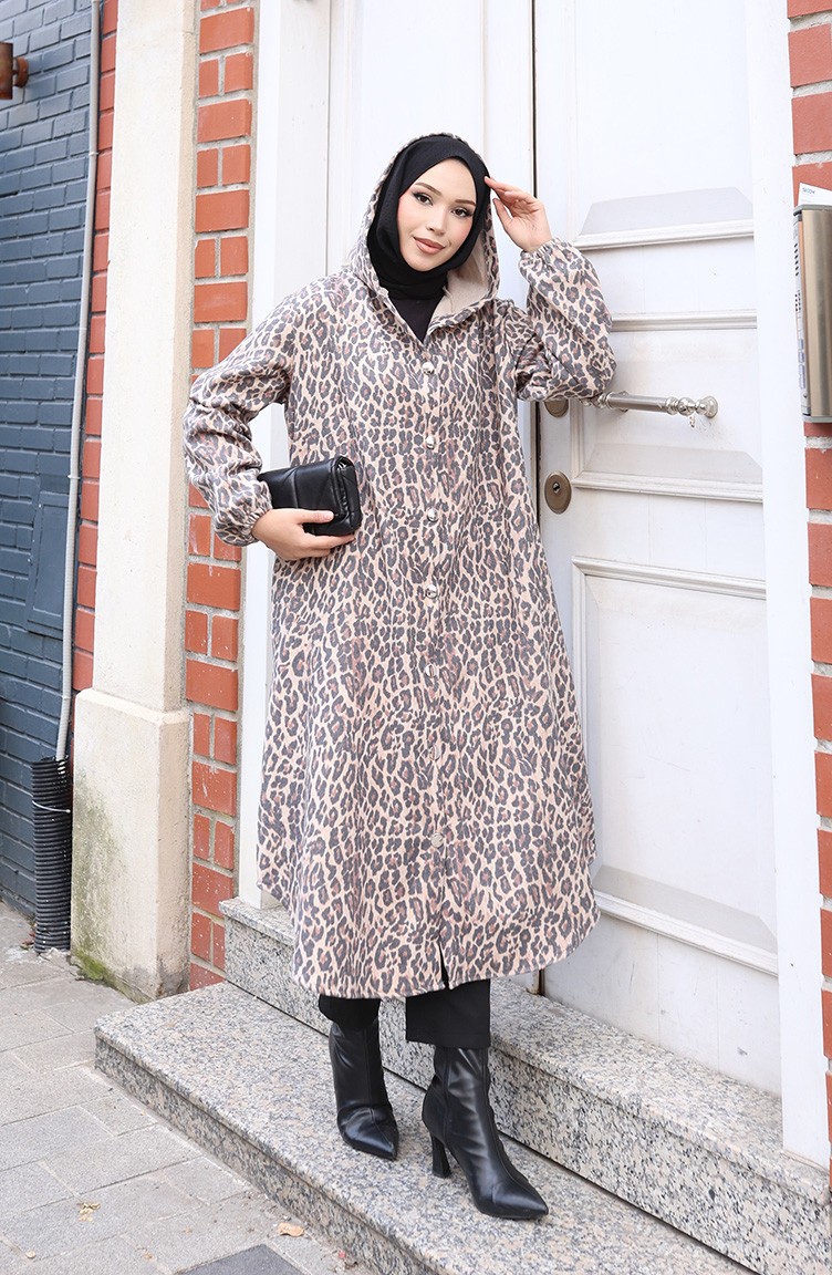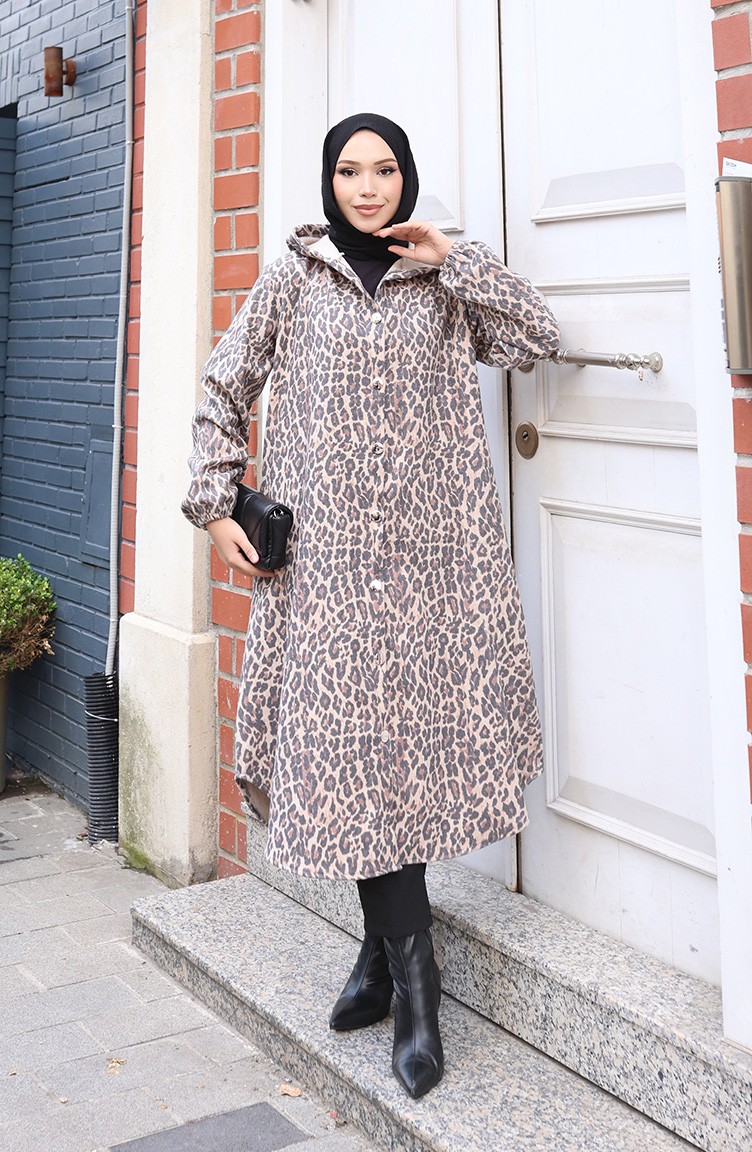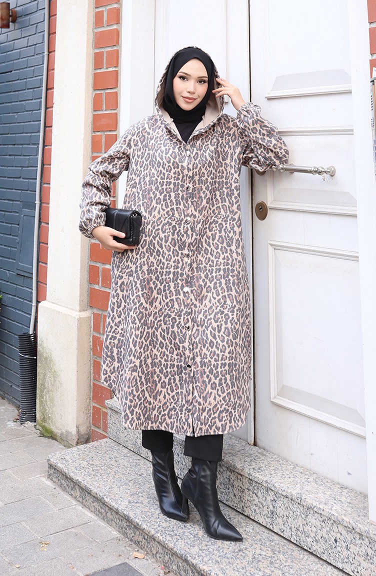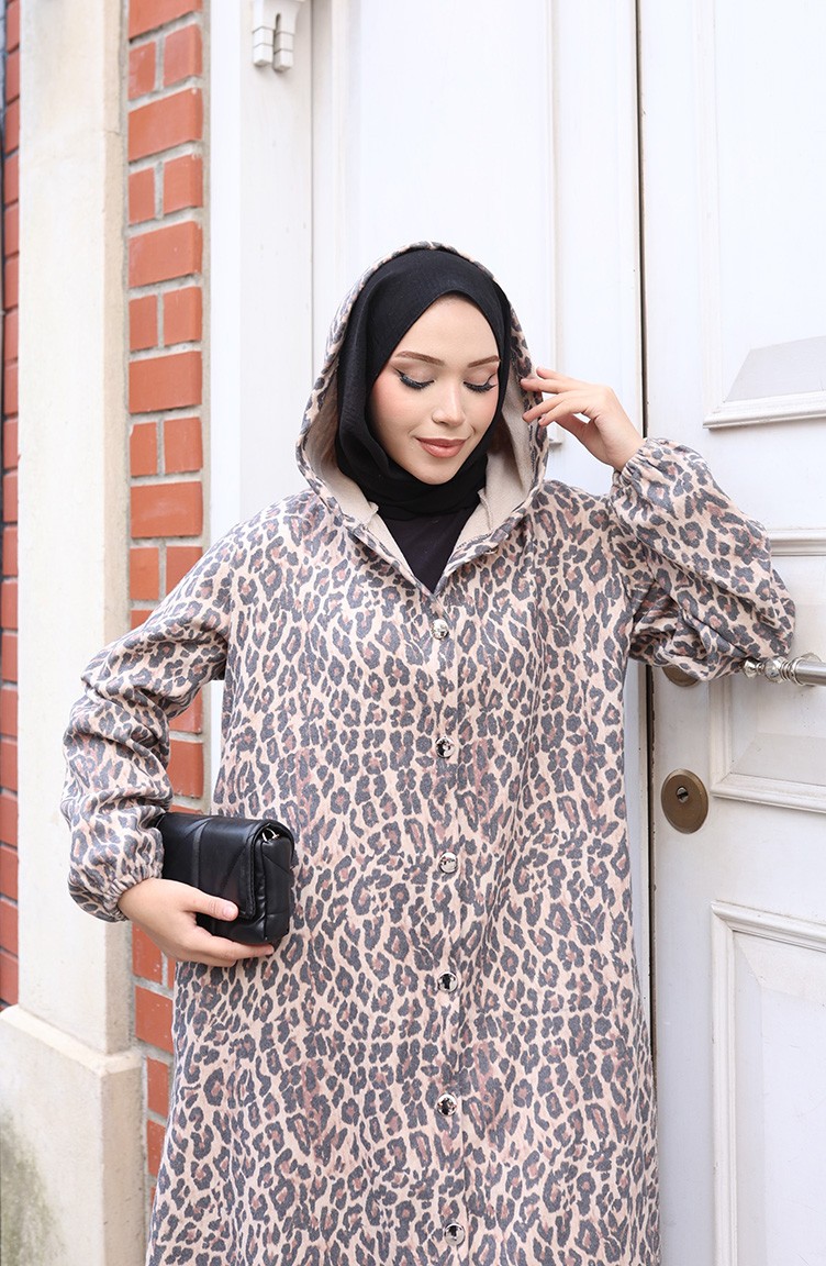 Manteau En Cachemire à Motif Léopard Avec Capuche Et Boutons 0226-01 Beige Anthracite 0226-01