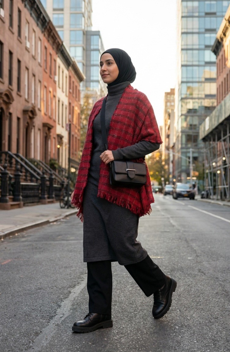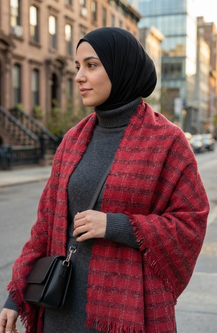 Couleur Rouge. Tissu de coton. Tissu à motifs. Hivernal. Produit porté par le mannequin est sa propre taille.