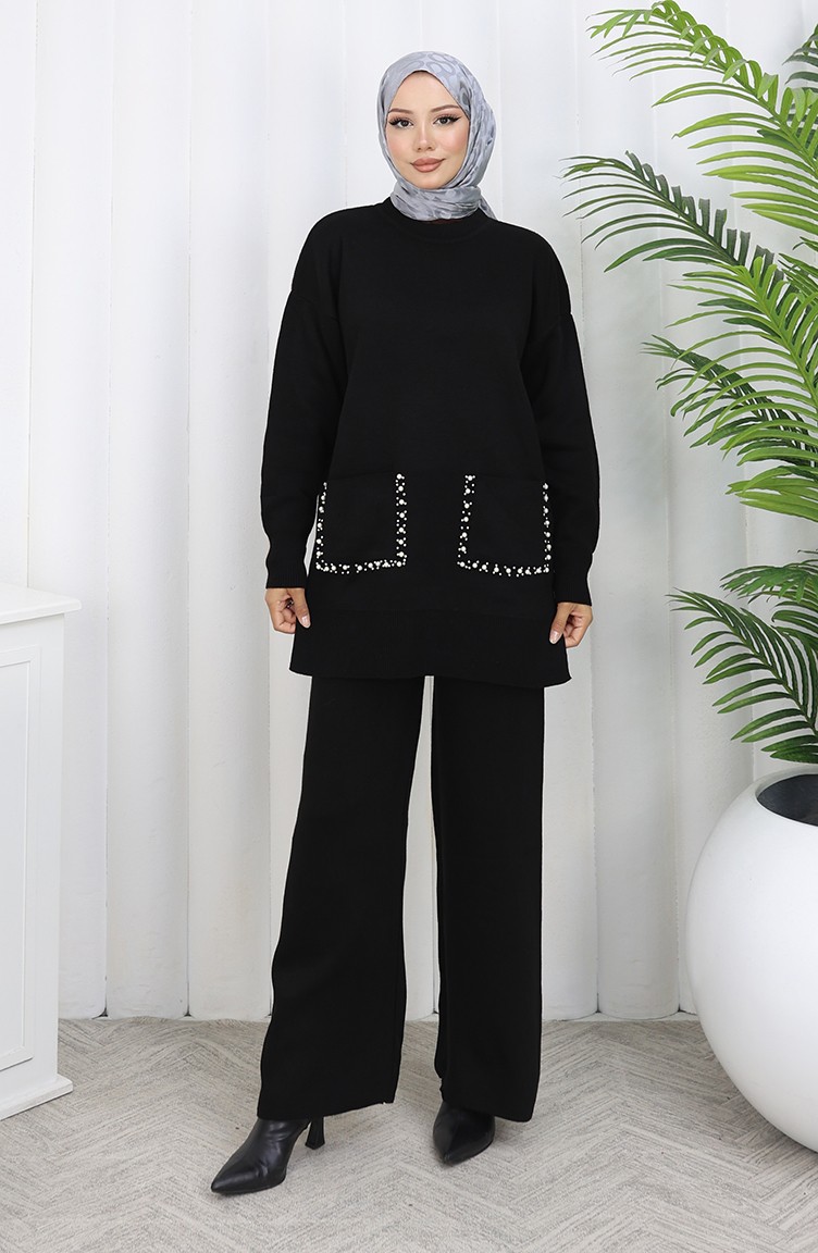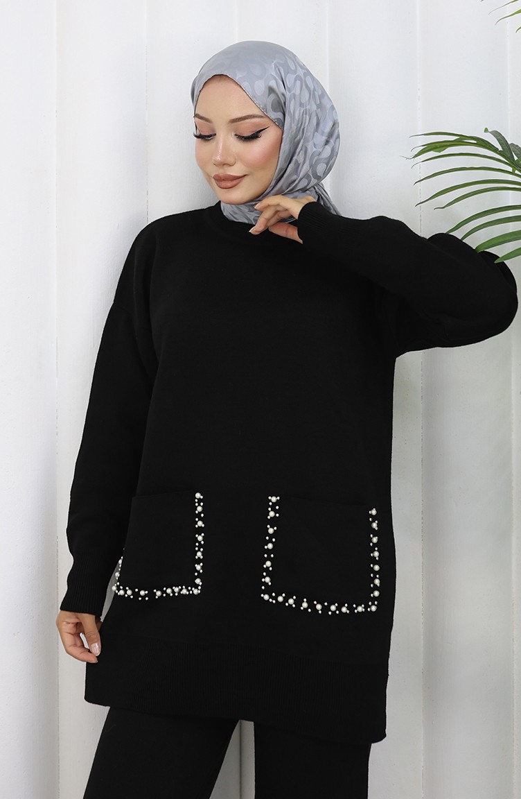 Ensemble Deux Pièces En Tricot Avec Poche Et Perles Tunique Et Pantalon 1070-06 Noir 1070-06