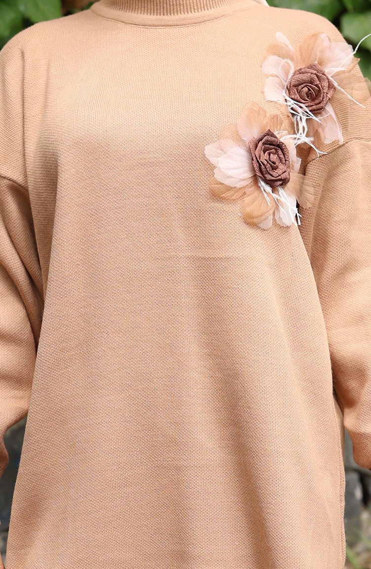 Ensemble Deux Pièces En Tricot Avec Tunique Et Pantalon à Appliqués Roses Couleur Café Au Lait 1036-05 1036-05