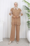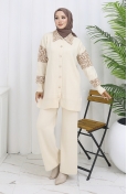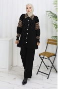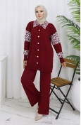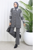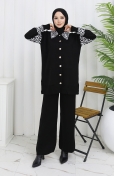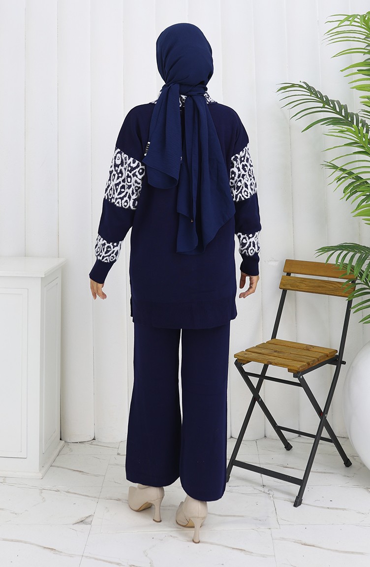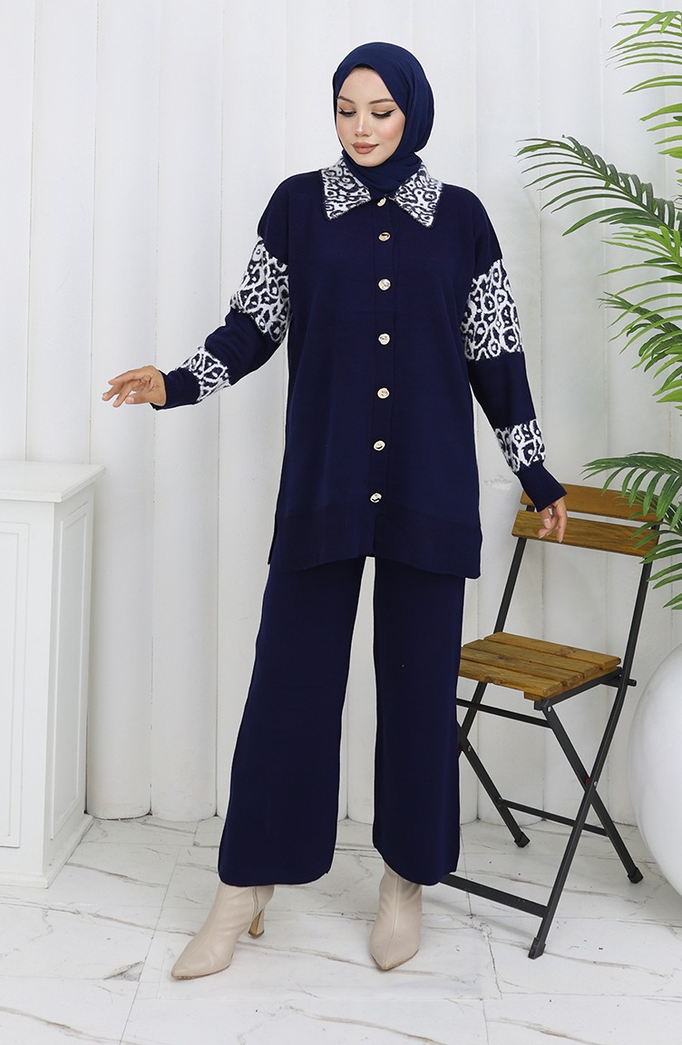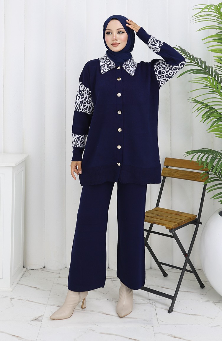 Ensemble Deux Pièces En Tricot Tunique Boutonnée Et Pantalon Garni 1020-01 Bleu Marine 1020-01