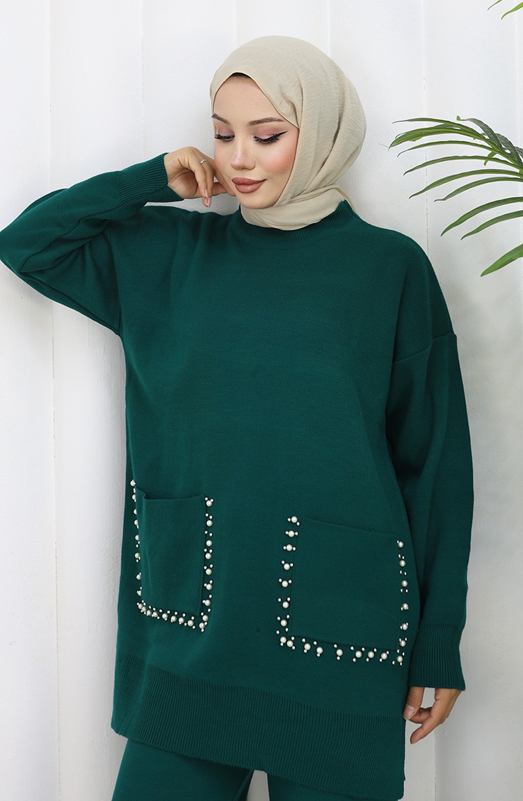 Ensemble Deux Pièces En Tricot Tunique Et Pantalon à Perles 1070-03 Pétrole 1070-03