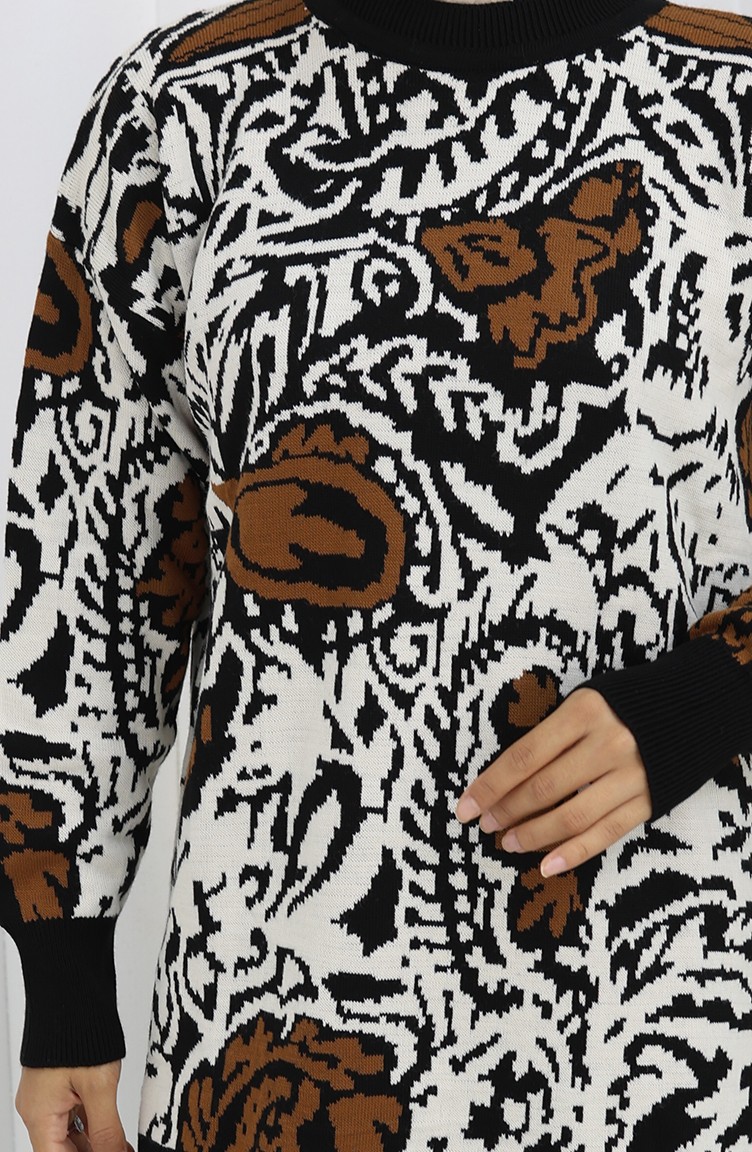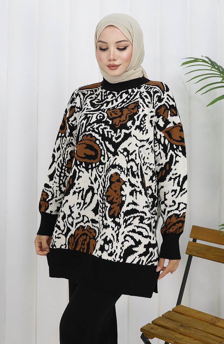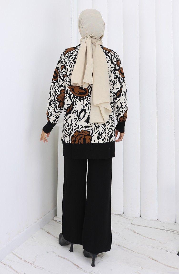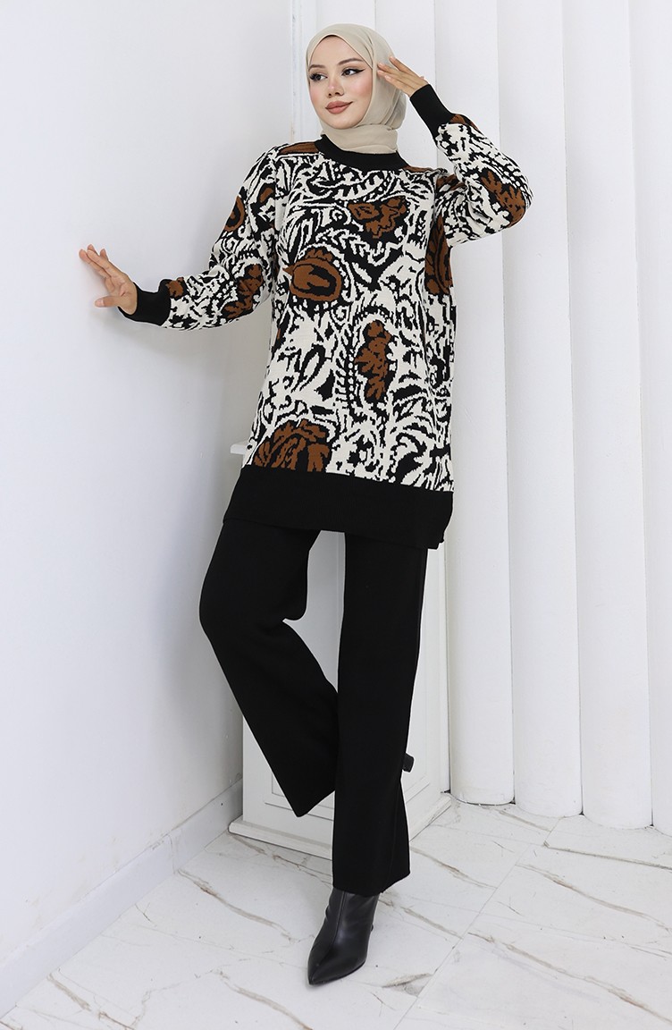 Ensemble Deux Pièces En Tricot Tunique Garnie Et Pantalon 1060-07 Noir Et Marron 1060-07