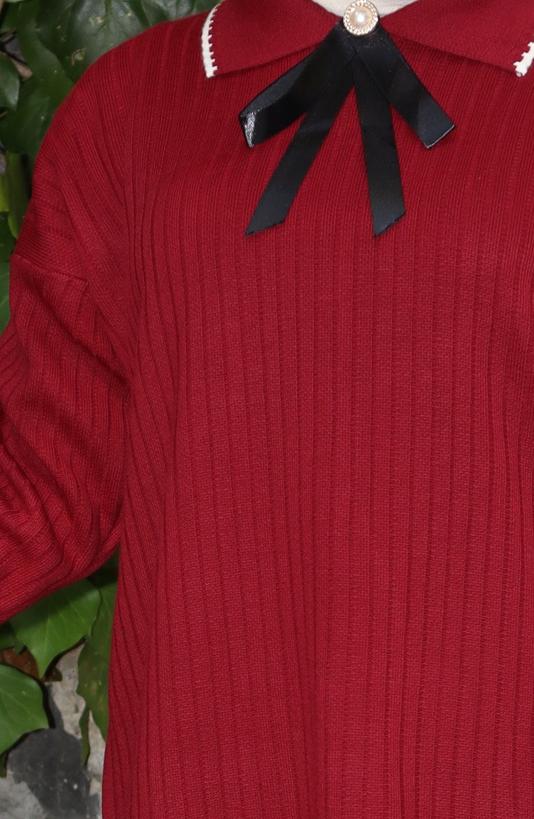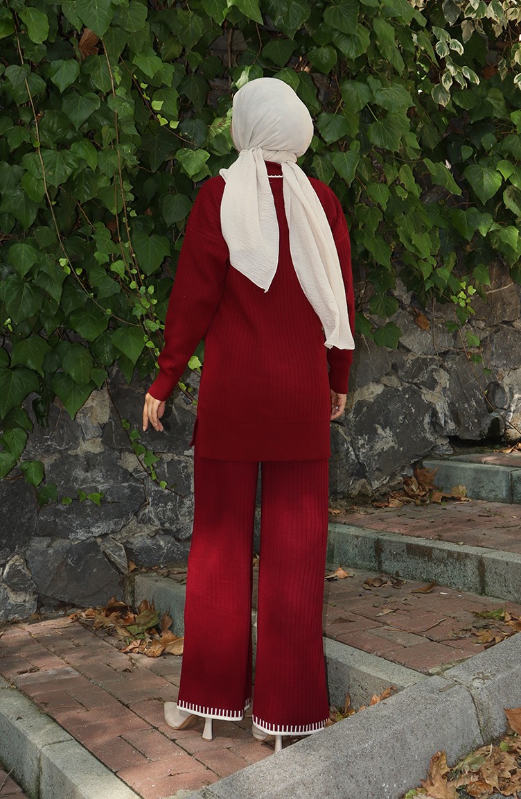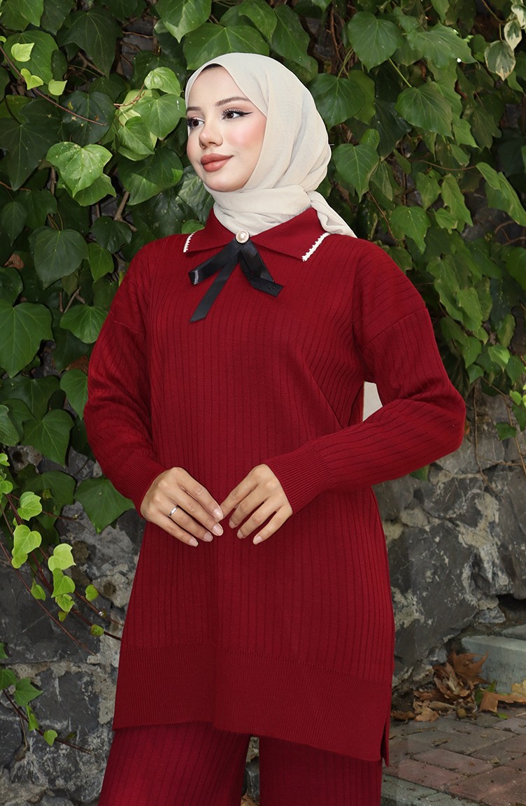 Ensemble Deux Pièces Tunique Et Pantalon En Tricot Avec Rubans 1064-02 Bordeaux 1064-02