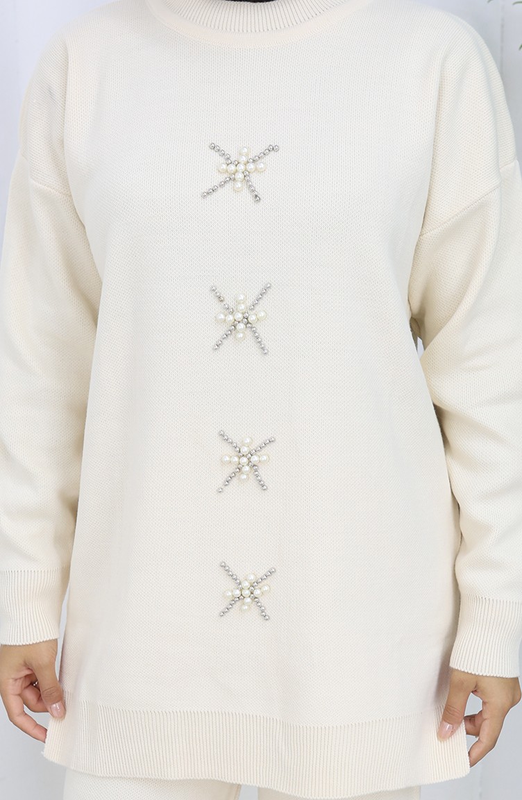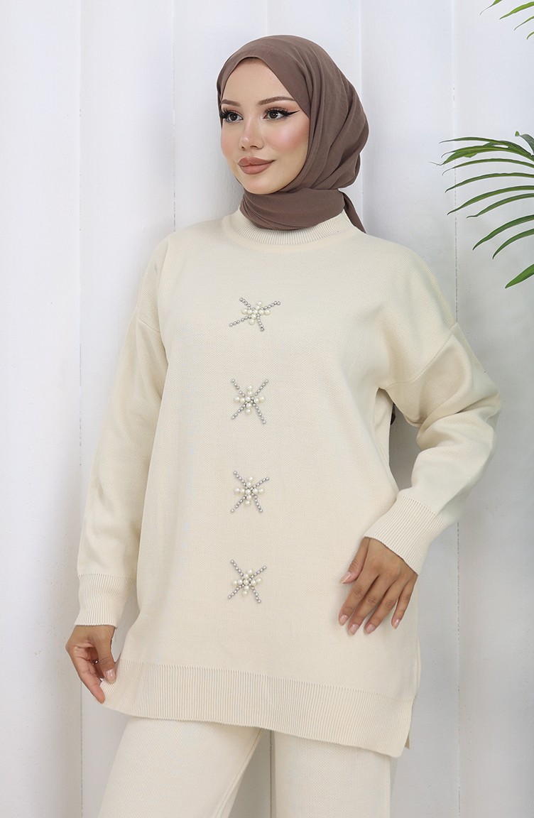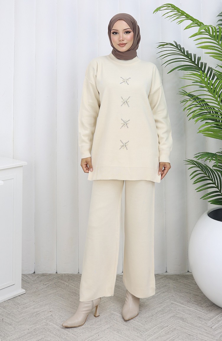 Ensemble Deux Pièces Tunique Et Pantalon En Tricot Brodé De Perles 1068-02 Beige 1068-02