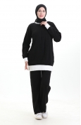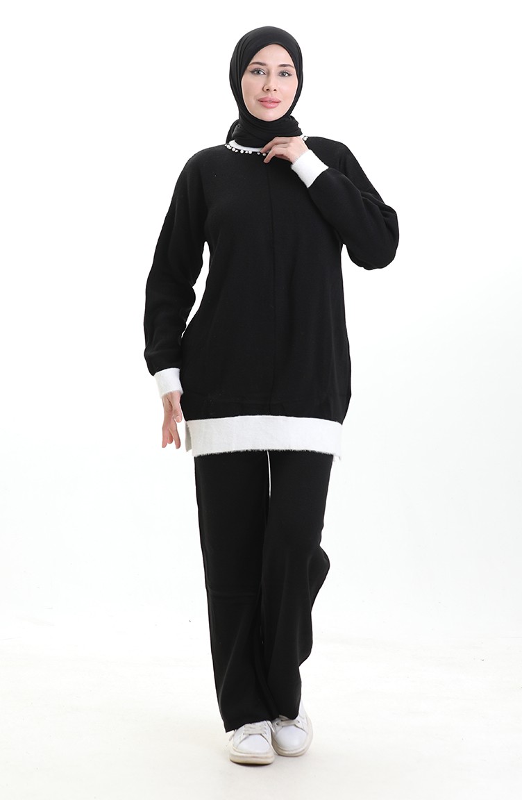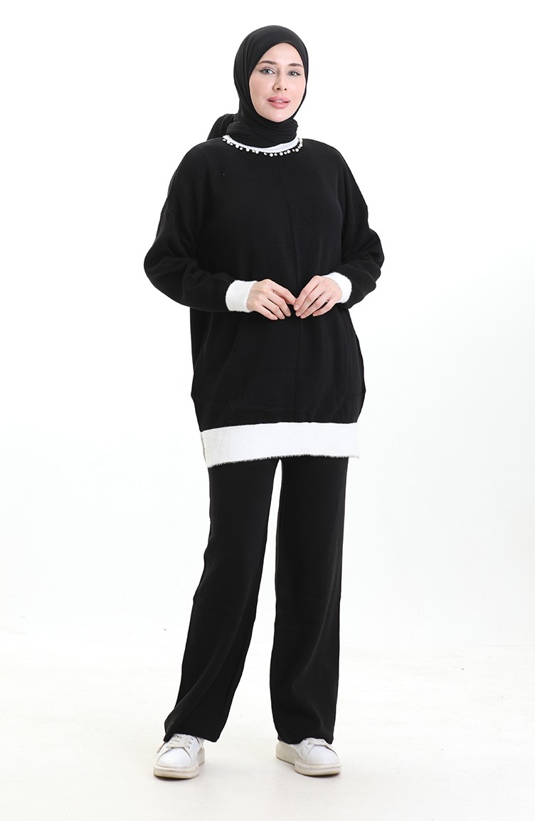 Ensemble Deux Pièces Tunique Et Pantalon En Tricot Orné De Perles 1011-09 Noir 1011-09
