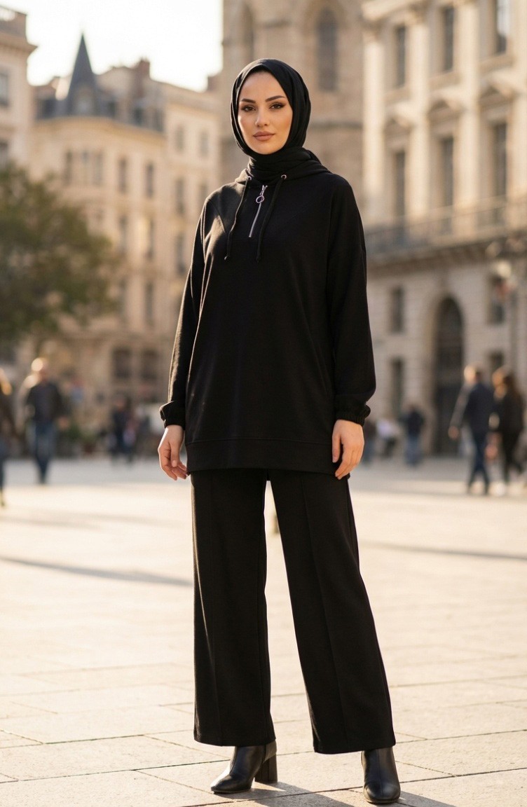 Ensemble Deux Pièces Tunique à Capuche Et Pantalon En Tissu Oysho 0236-01 Noir 0236-01