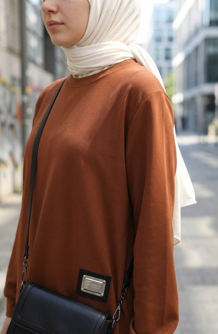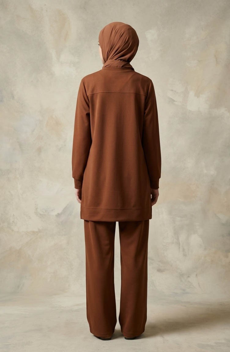 Couleur Tabac. Tissu de coton. Simple. Tunique. Col Zéro. Adapté pour les 4 saisons. Produit porté par le mannequin est sa propre taille.