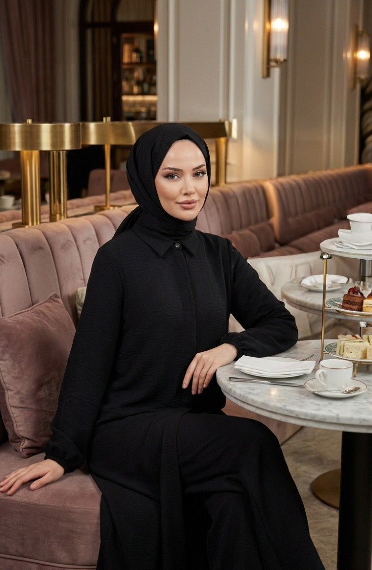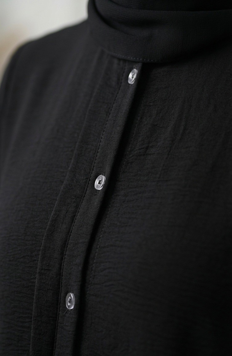 Couleur Noire. Aerobin. Simple. Tunique. Manches élastiques. Col Chemise. Adapté pour les 4 saisons. Produit porté par le mannequin est sa propre taille.