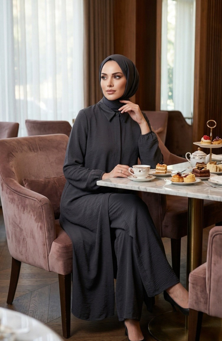 Couleur antracite. Aerobin. Simple. Tunique. Manches élastiques. Col Chemise. Adapté pour les 4 saisons. Produit porté par le mannequin est sa propre taille.