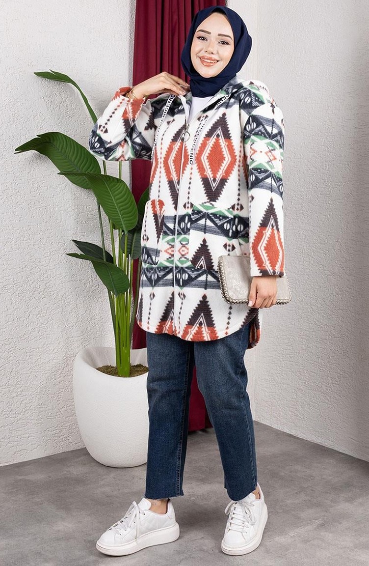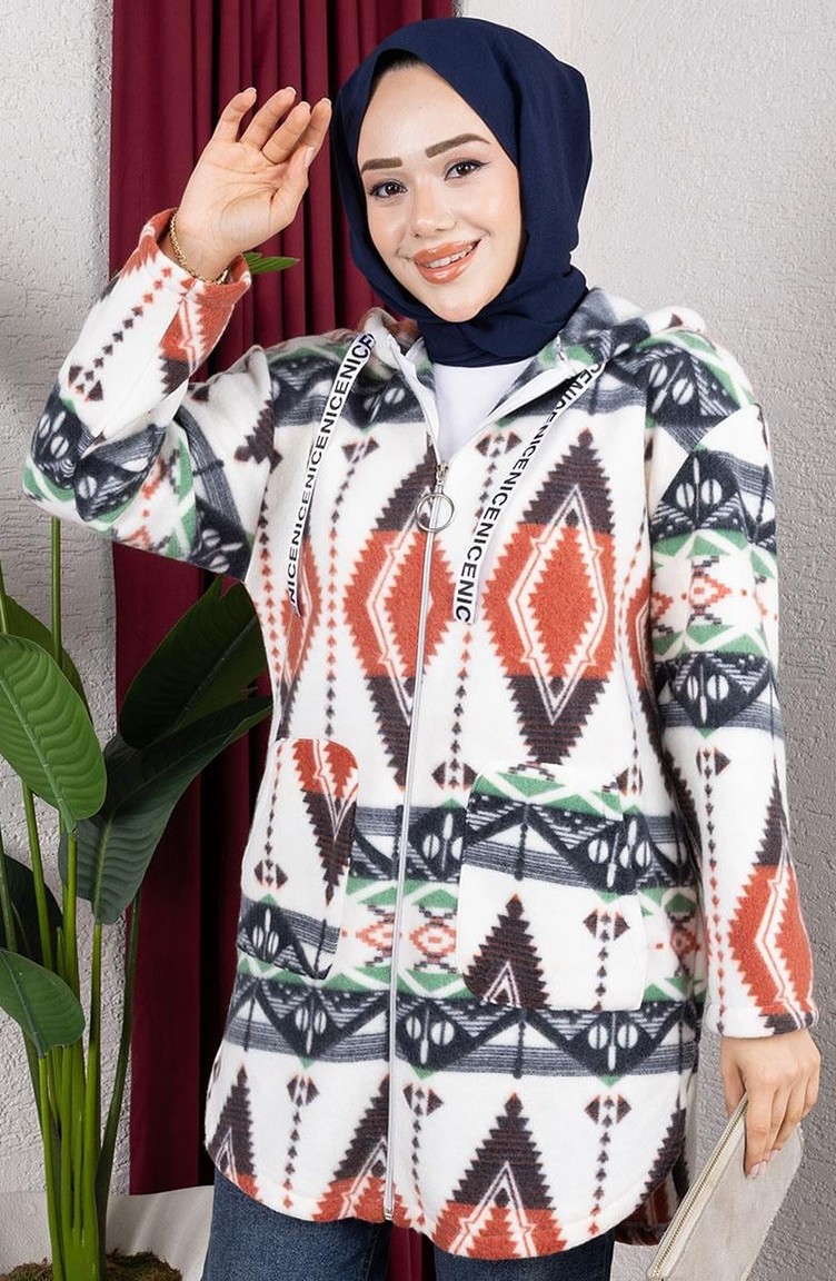 Couleur Saumon. Tissu polaire. Tissu à motifs. Avec Fermeture. Hivernal. Produit porté par le mannequin est sa propre taille.