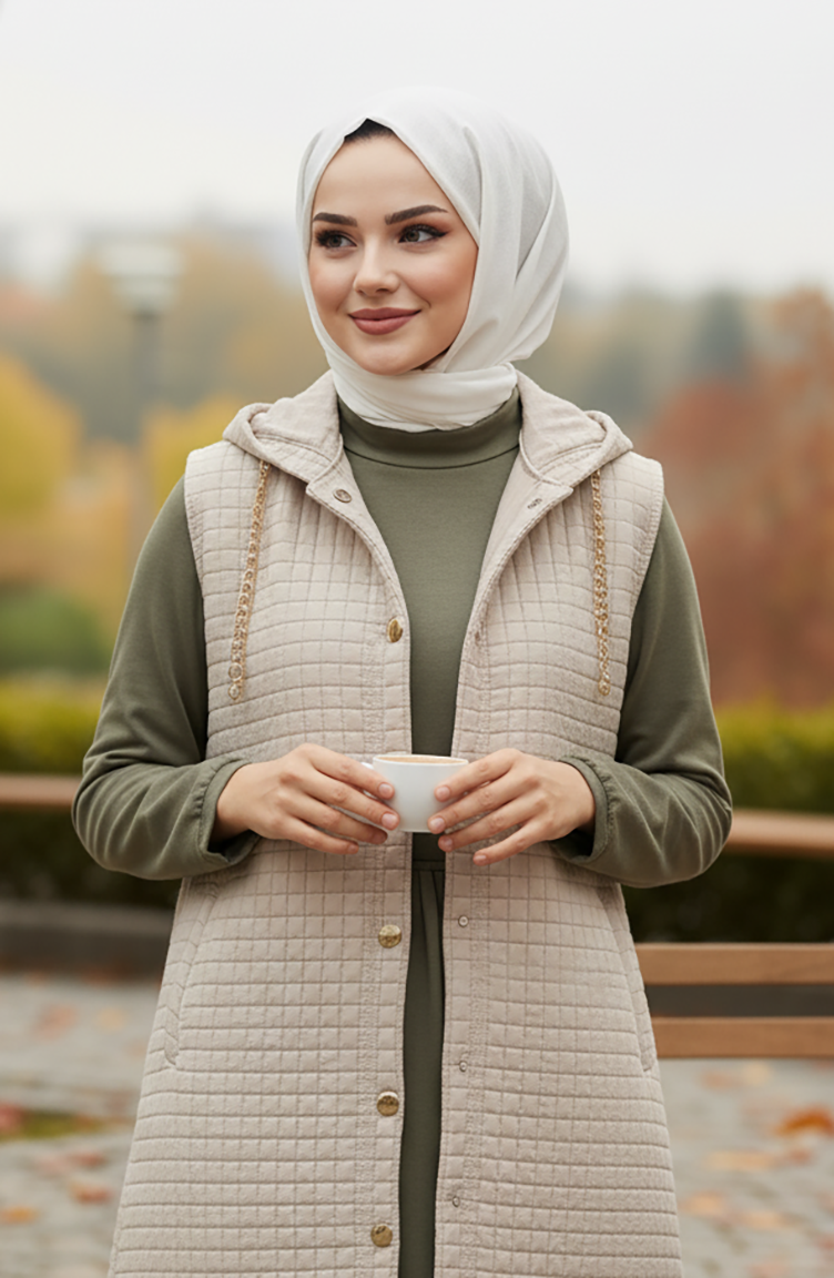 Gilet Matelassé à Capuche Et Boutons Motif Baklava Beige 51340-01 51340-01