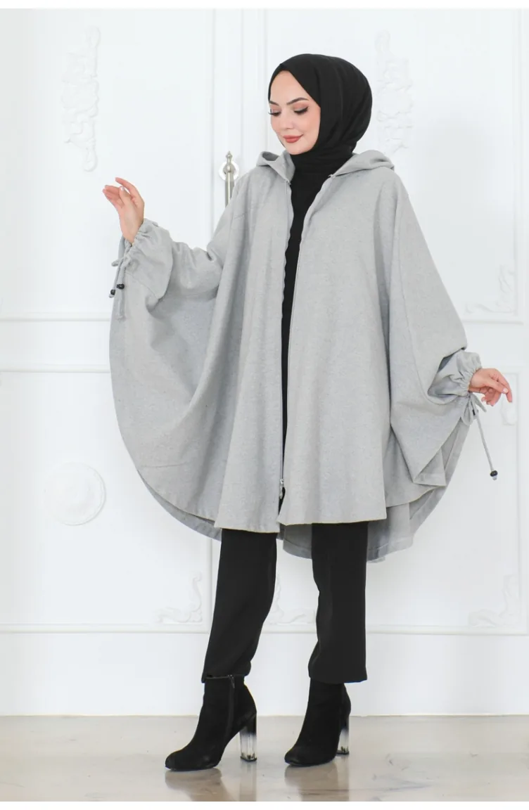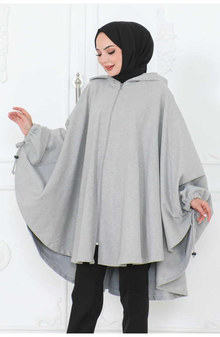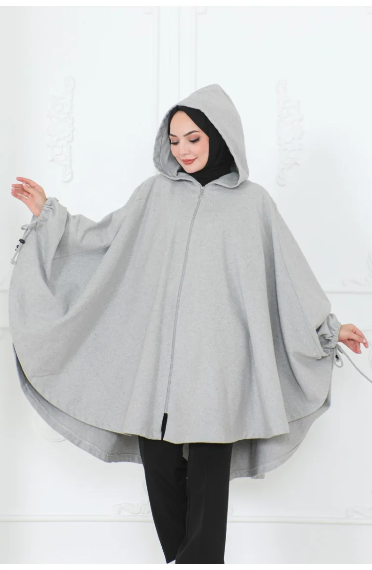 La couleur Gris. C'est un tissu molleton, vous pouvez l'utiliser facilement en hiver. Simple. Hivernal. Coupe large.
