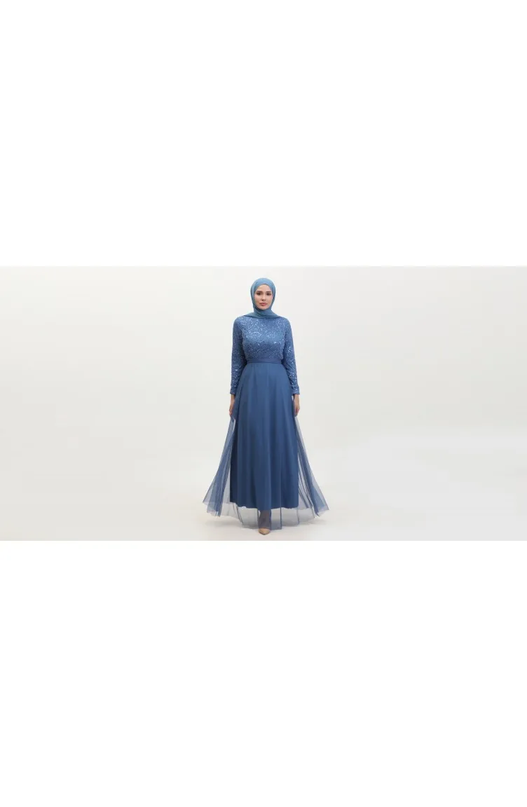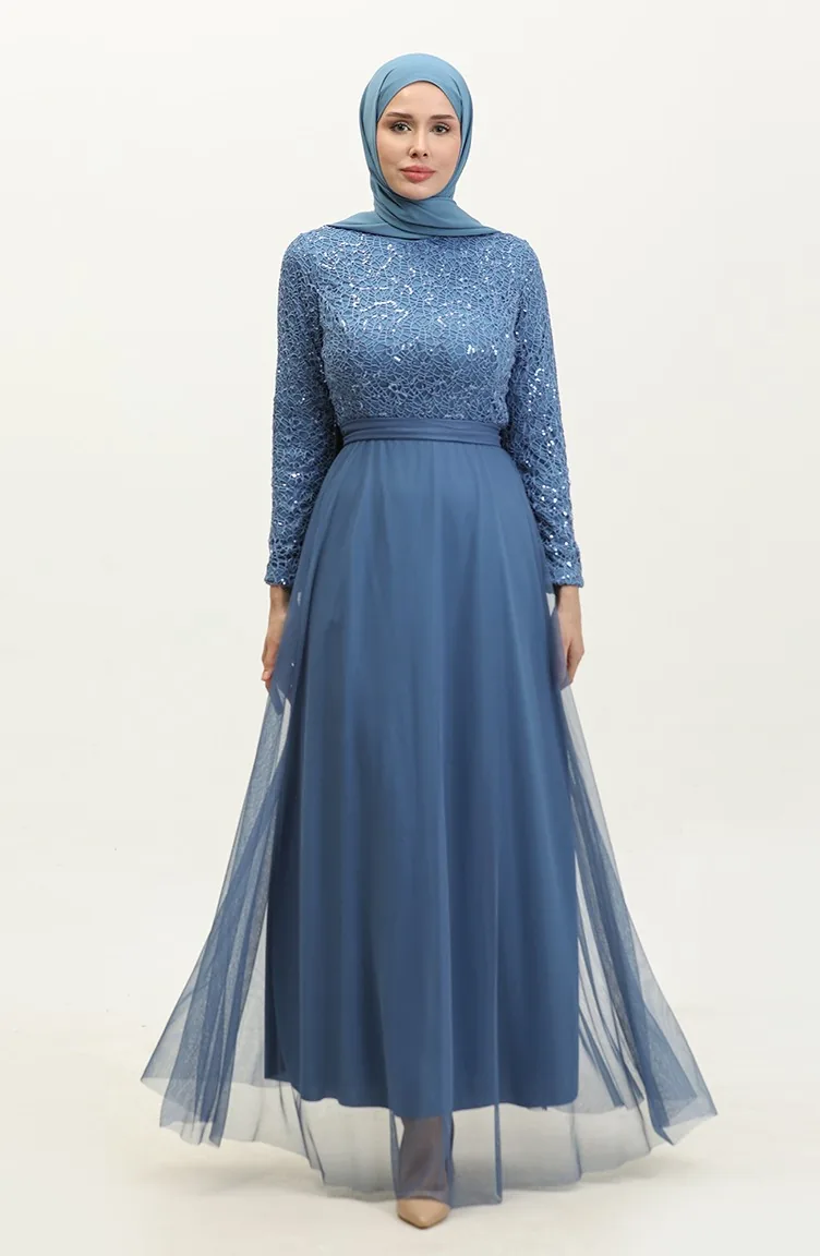 Robe De Soirée à Ceinture En Dentelle 5353A-07 Bleu 5353A-07