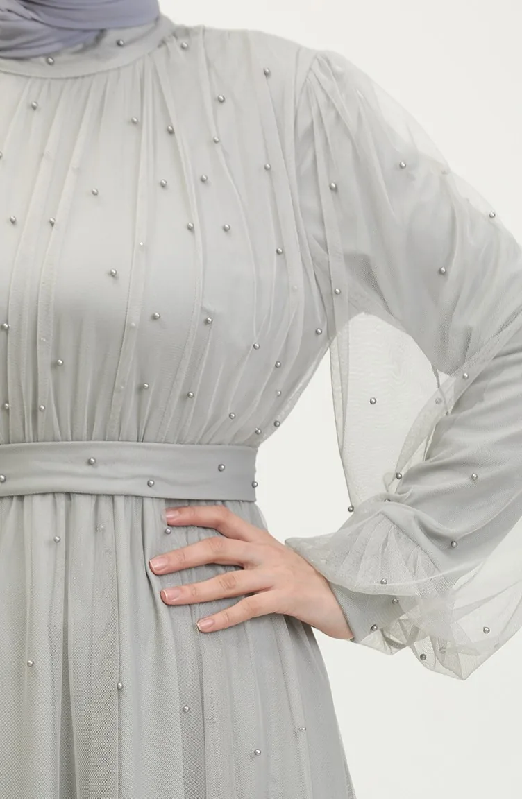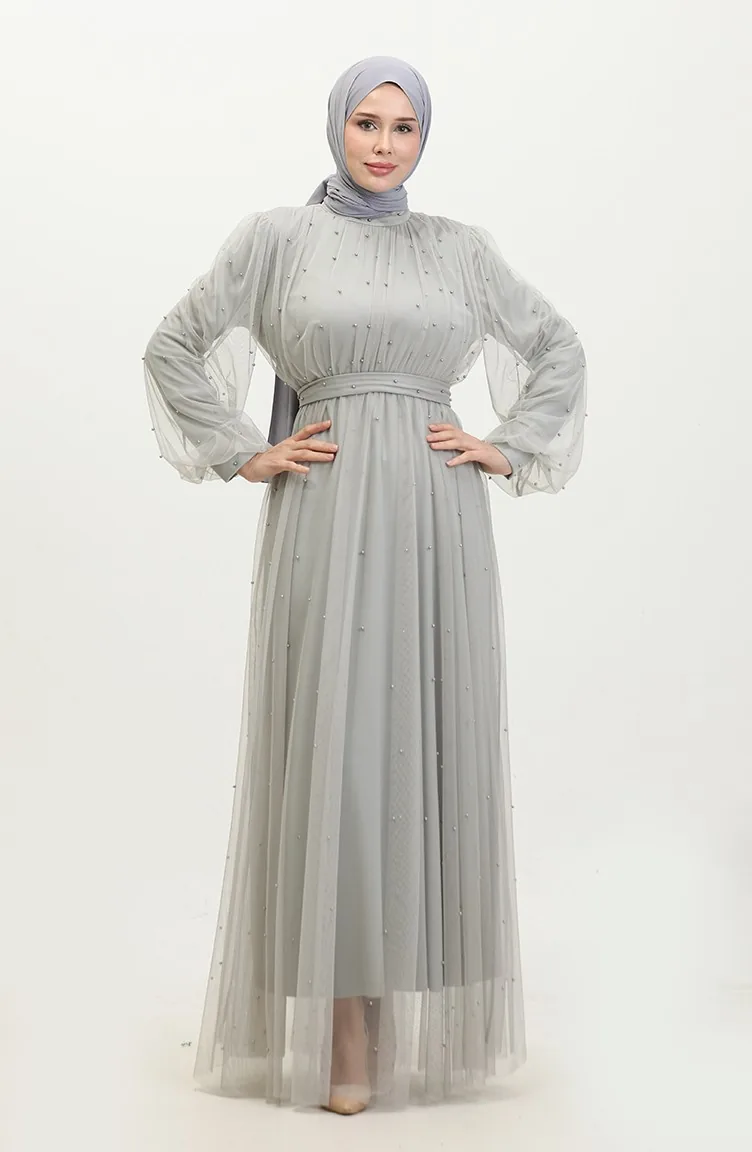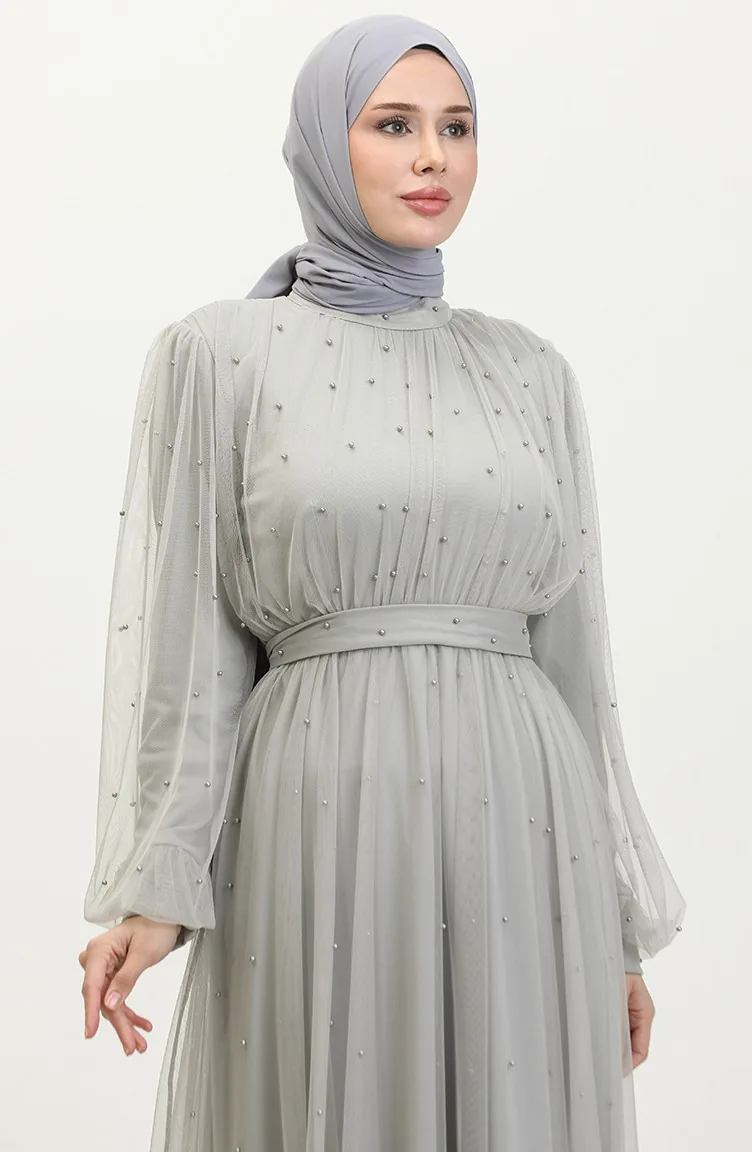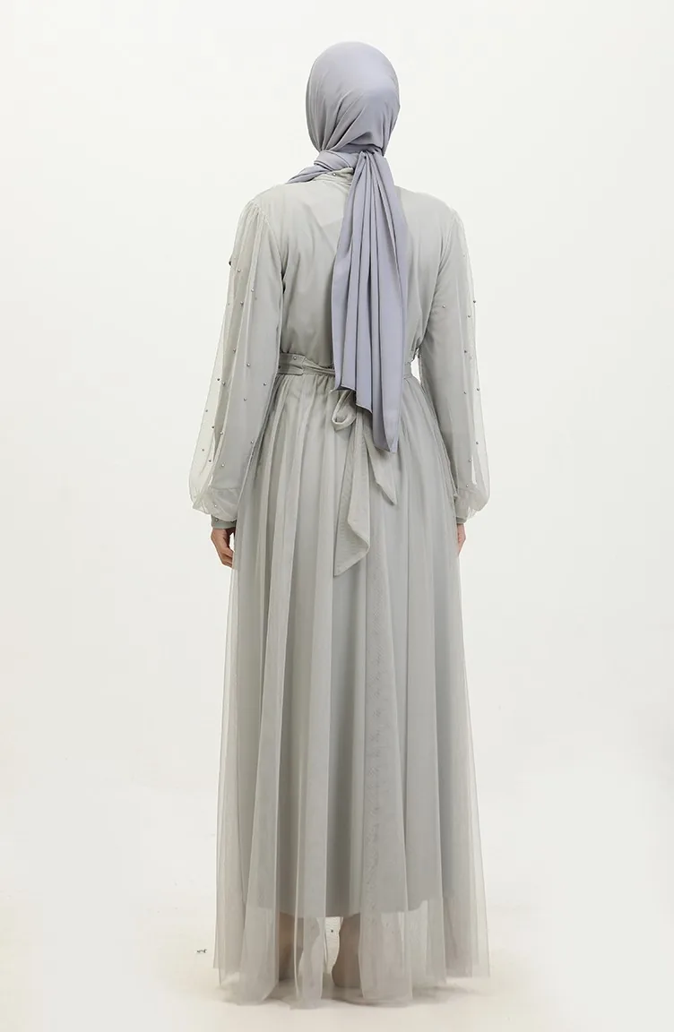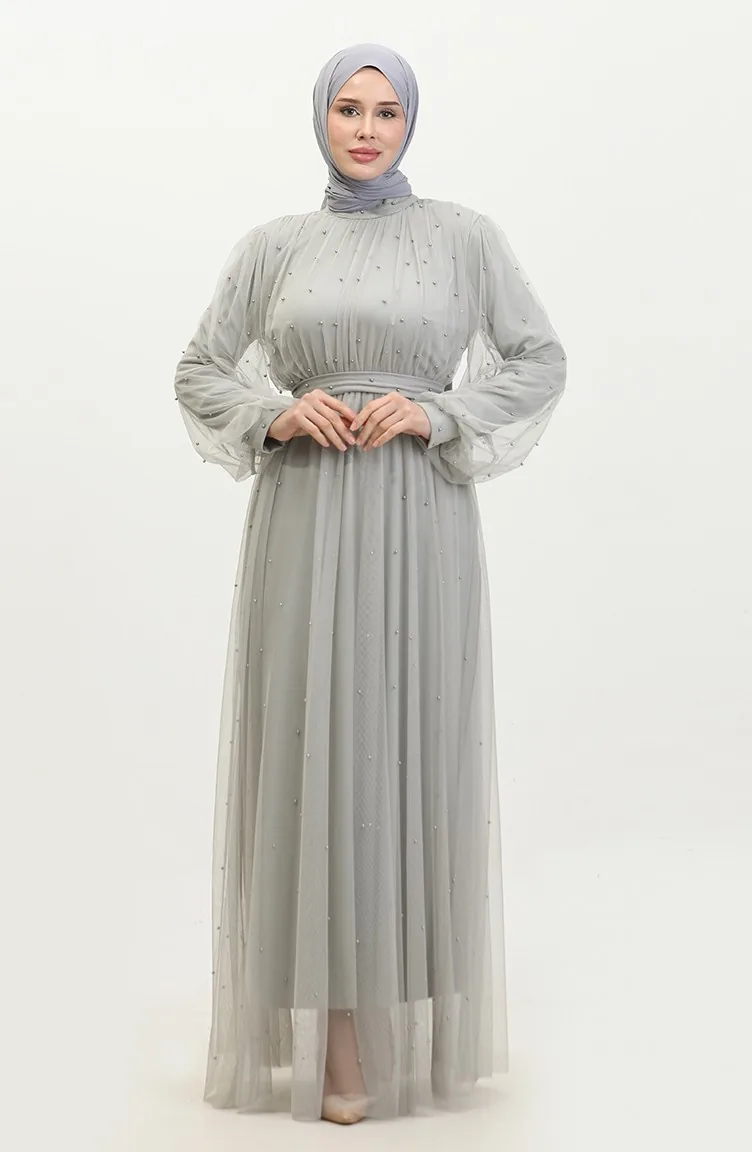 Robe De Soirée Tulle Perlé 6233-01 Gris Clair 6233-01