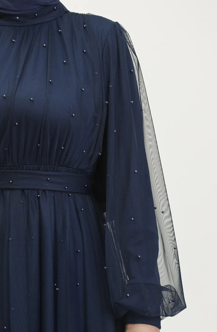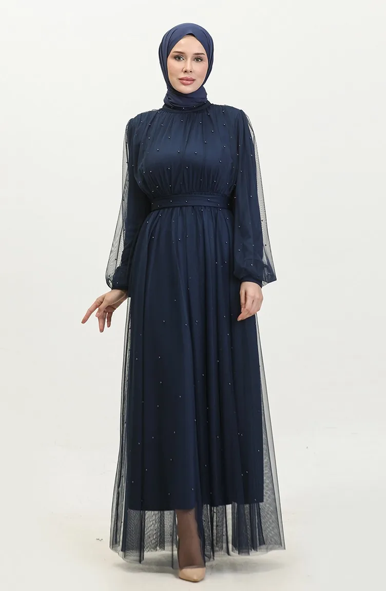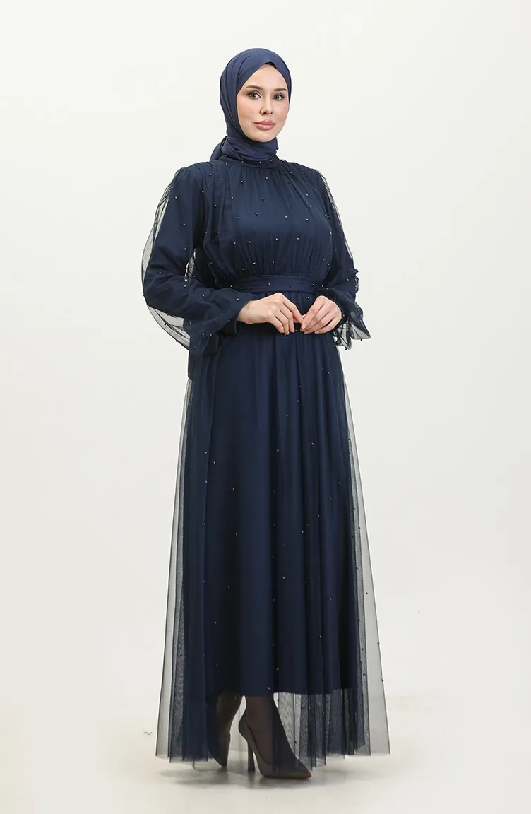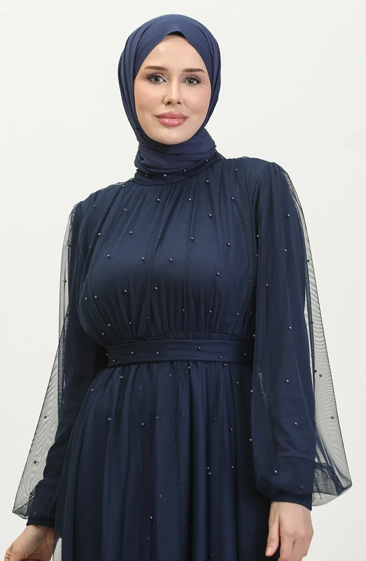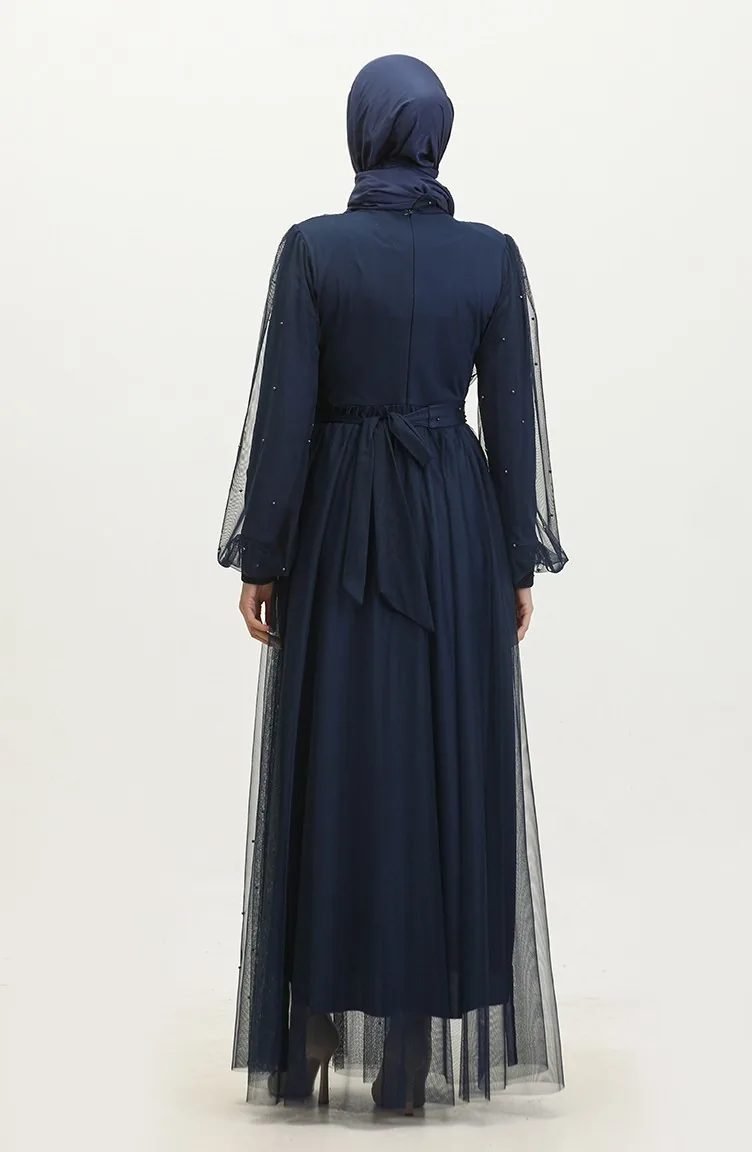 Robe De Soirée Tulle Perlé 6233-11 Bleu Marine 6233-11