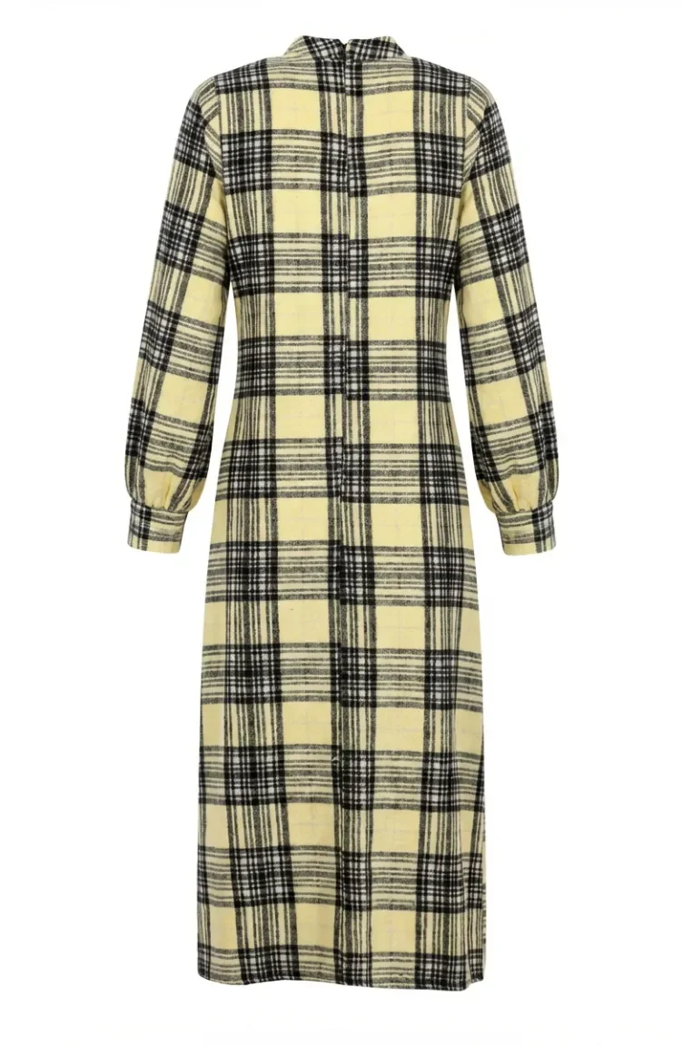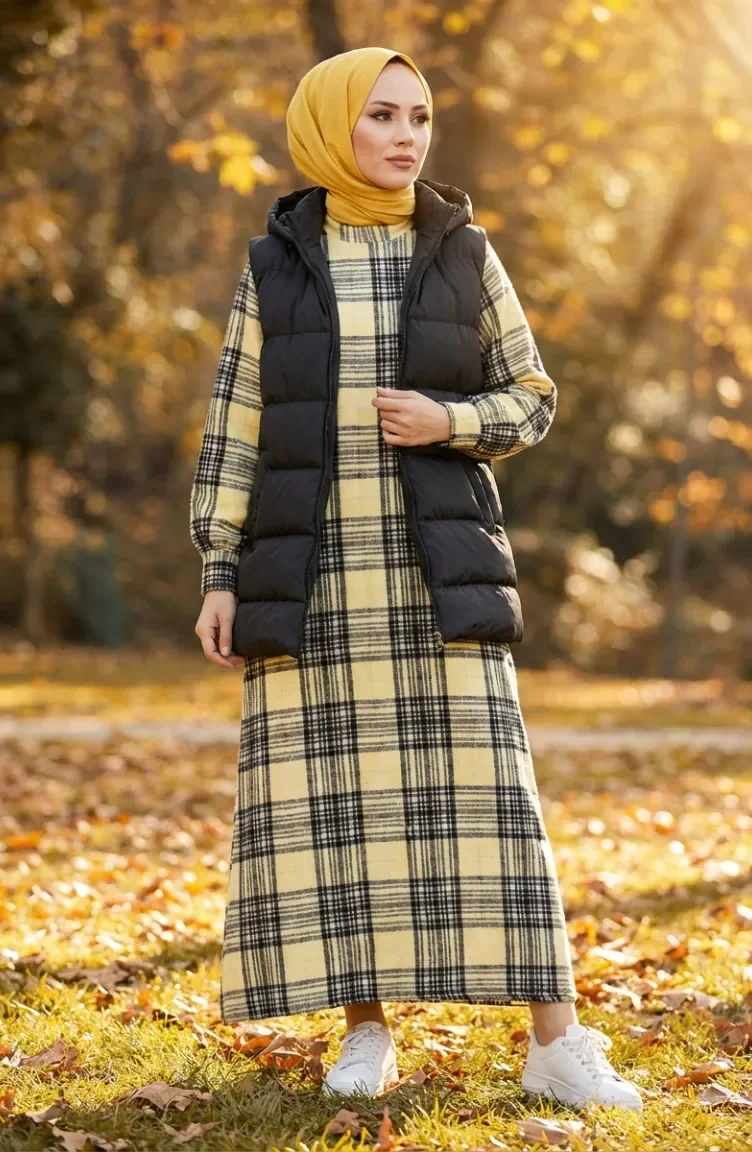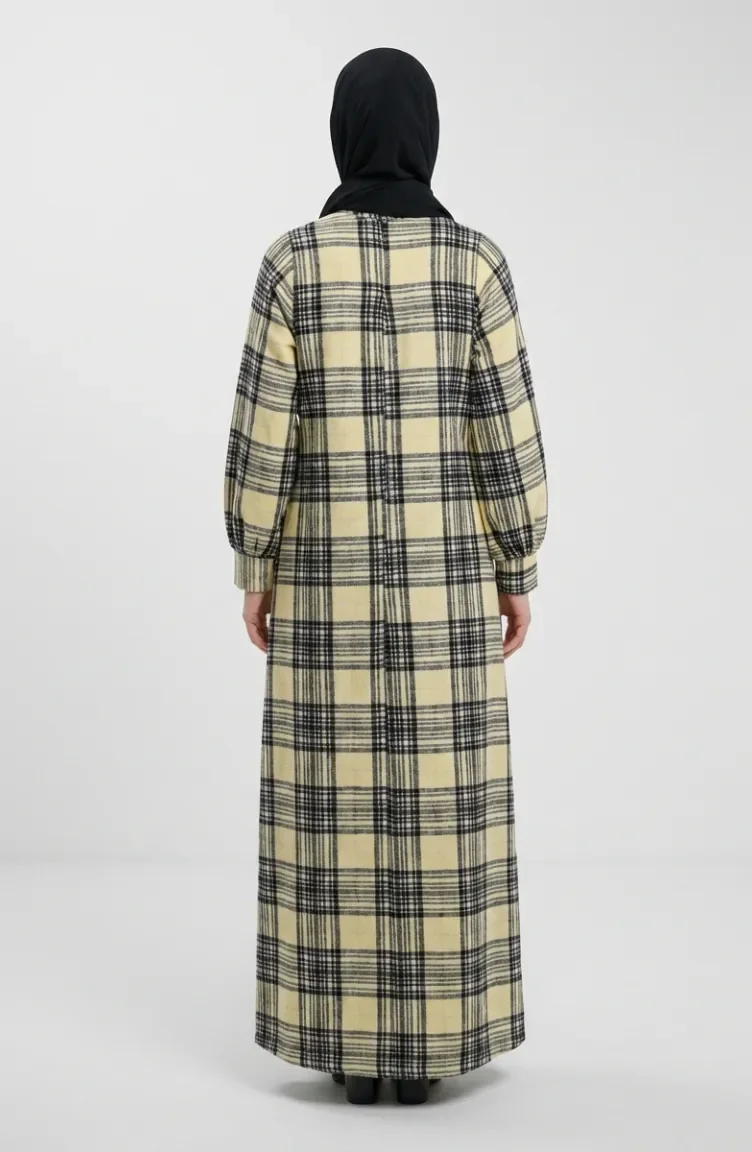 Couleur Jaune. Tissu polyester. Motifs a Carreaux. Avec Fermeture. Col Zéro. Hivernal. Produit porté par le mannequin est sa propre taille.