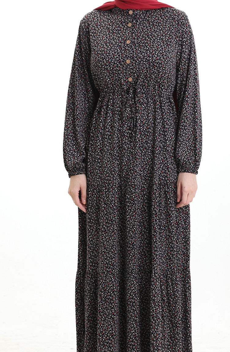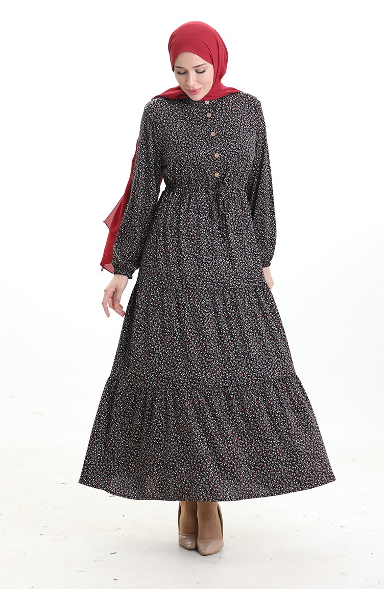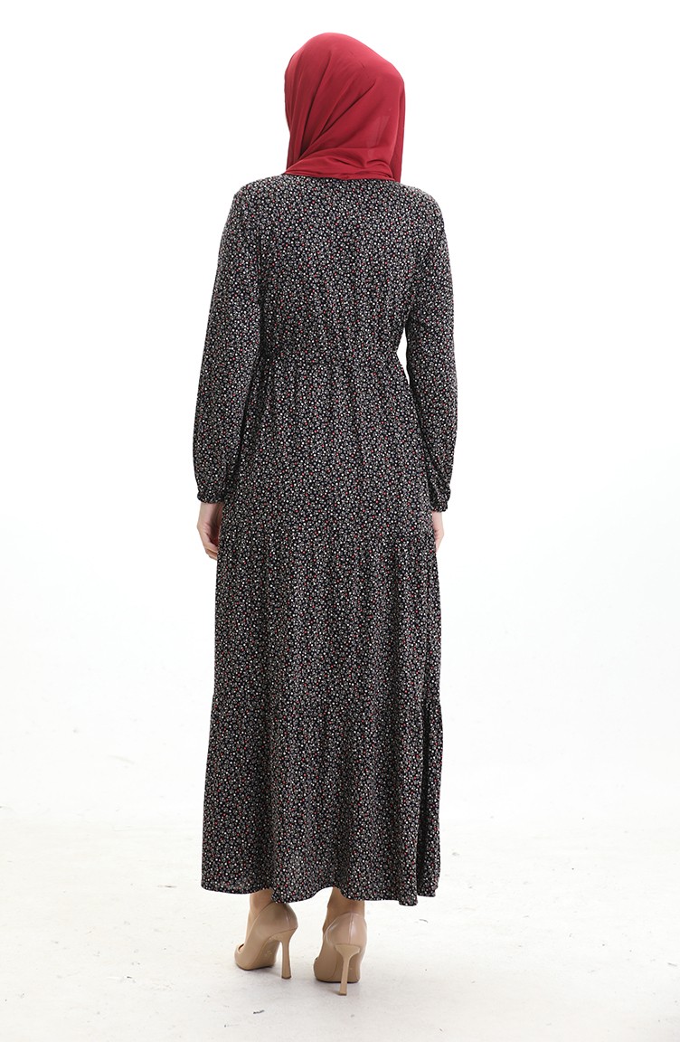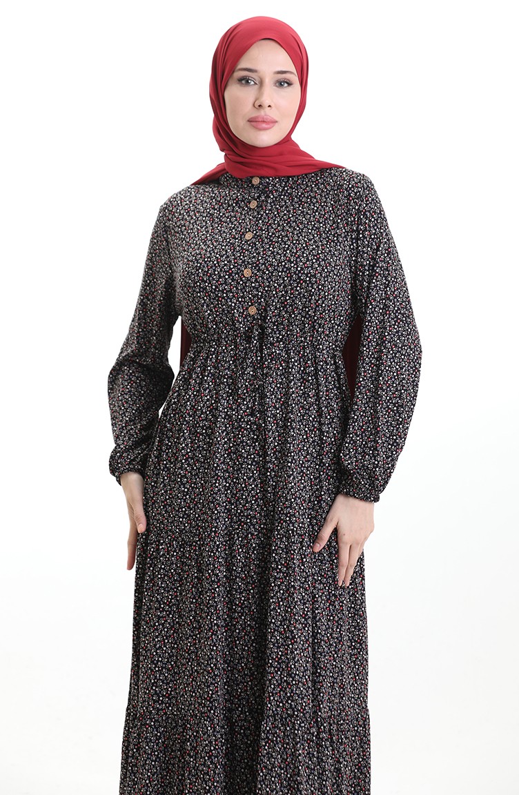 Robe à Col Mandarin Et Motifs Floraux 0197-01 Noir Lilas 0197-01