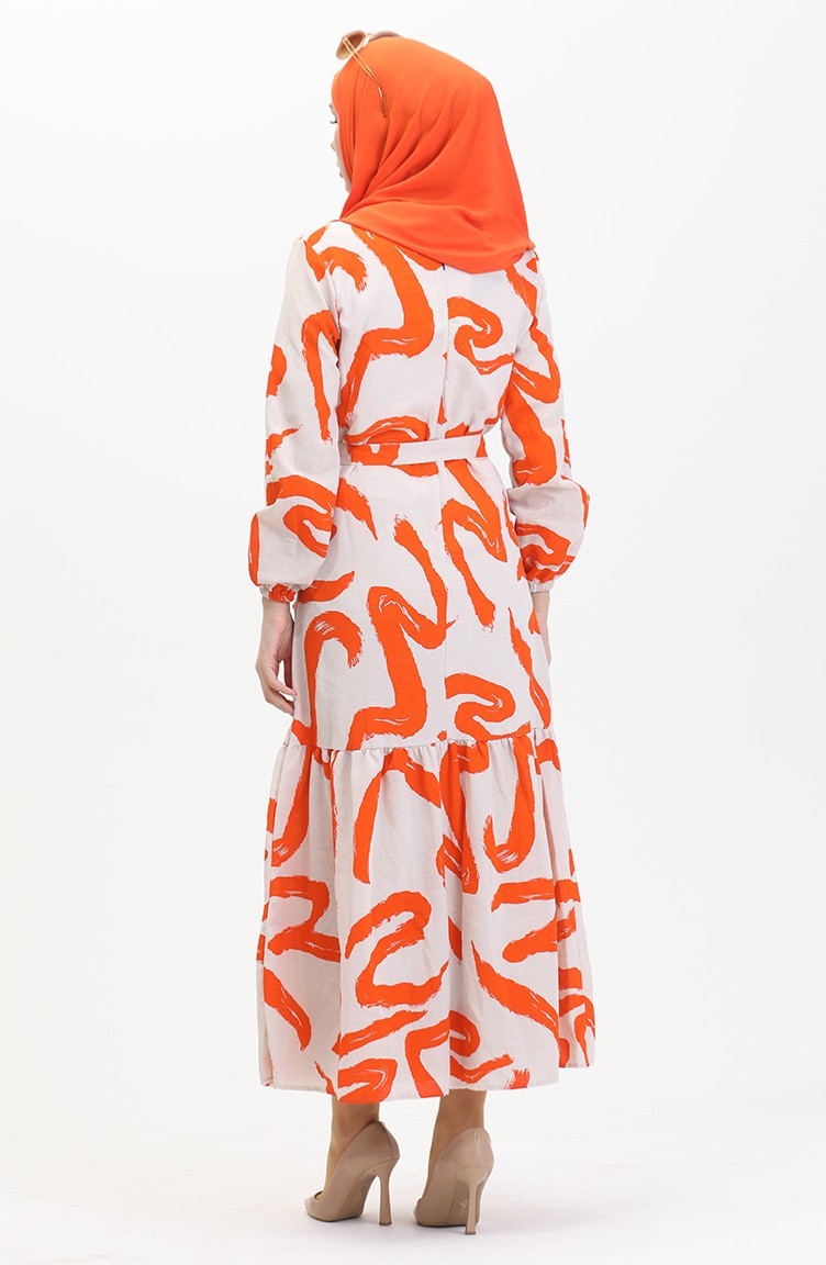 Robe Lin à Motifs Et Ceinture 0471A-07 Beige Orange 0471A-07