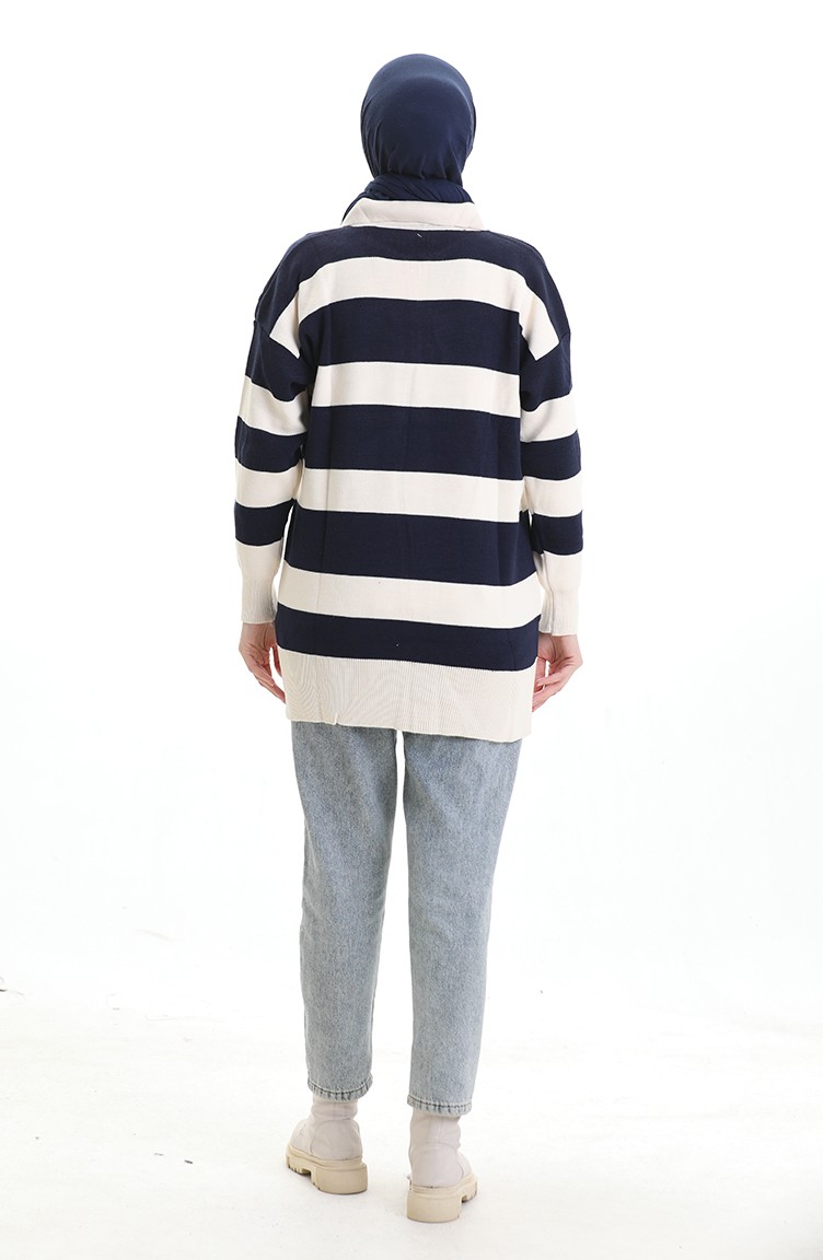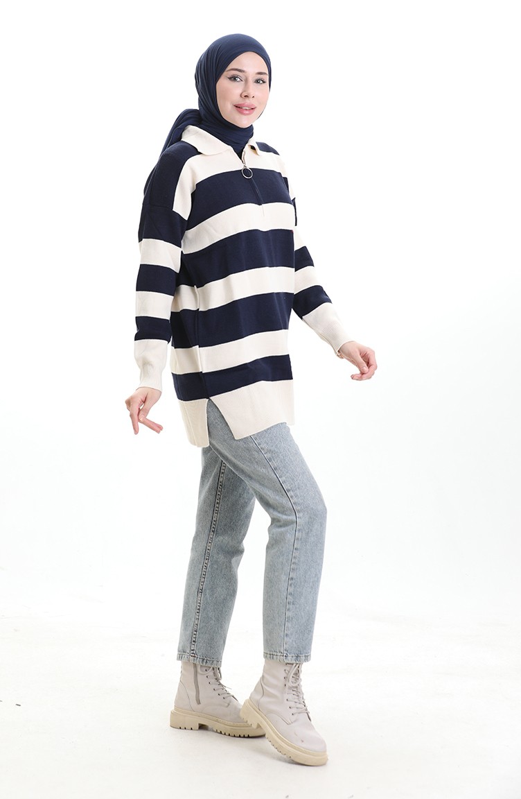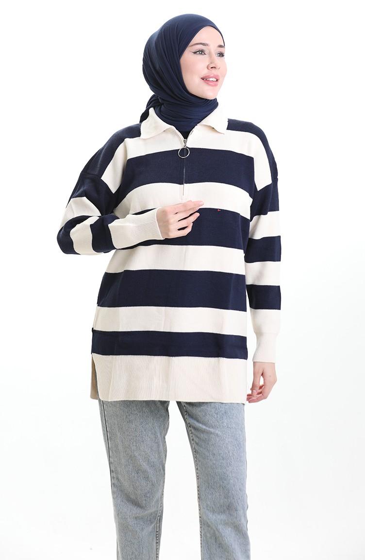 Tunique Zippée En Tricot Color Block 3003-12 Bleu Marine 3003-12