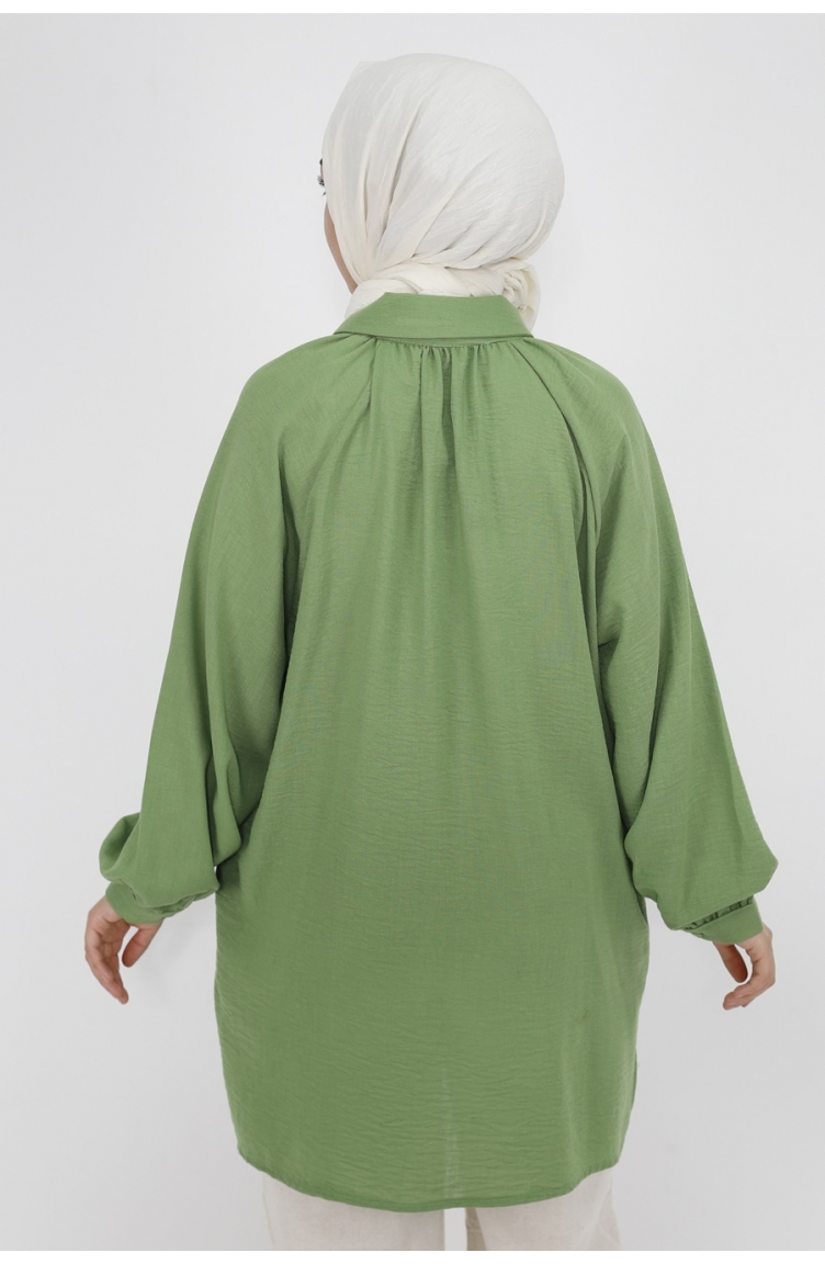Yeşil renktedir. Keten kumaş. Sade. Taş işlemeli. Balon Kol. Gömlek yaka detayı ile kullanışlı modeldir. Yazlık. Kadın. Geniş kesimli.