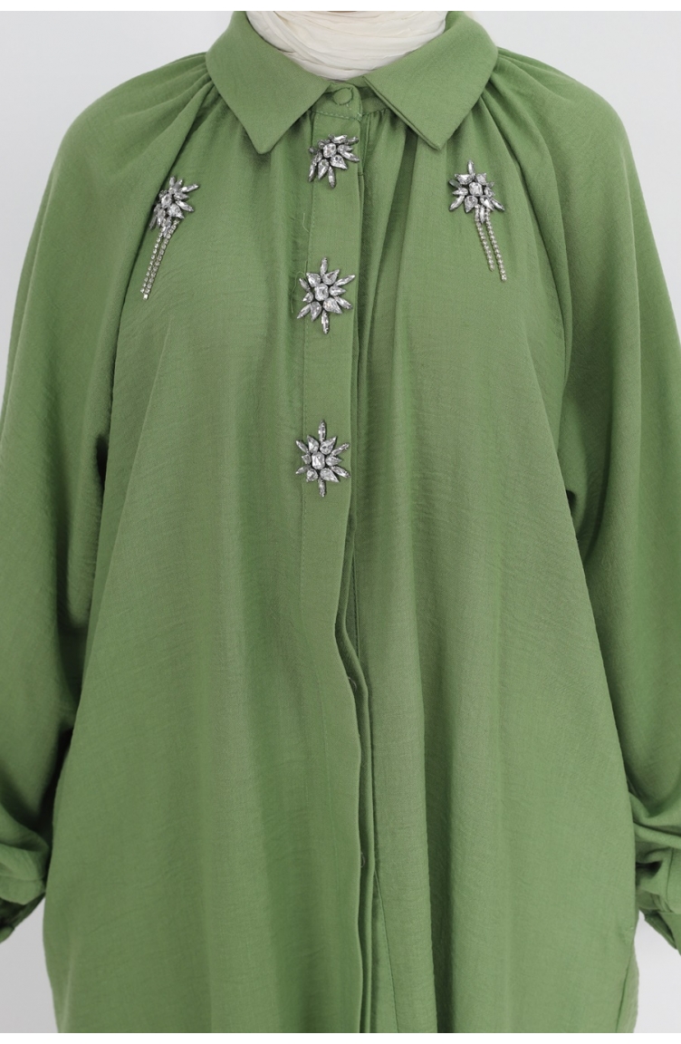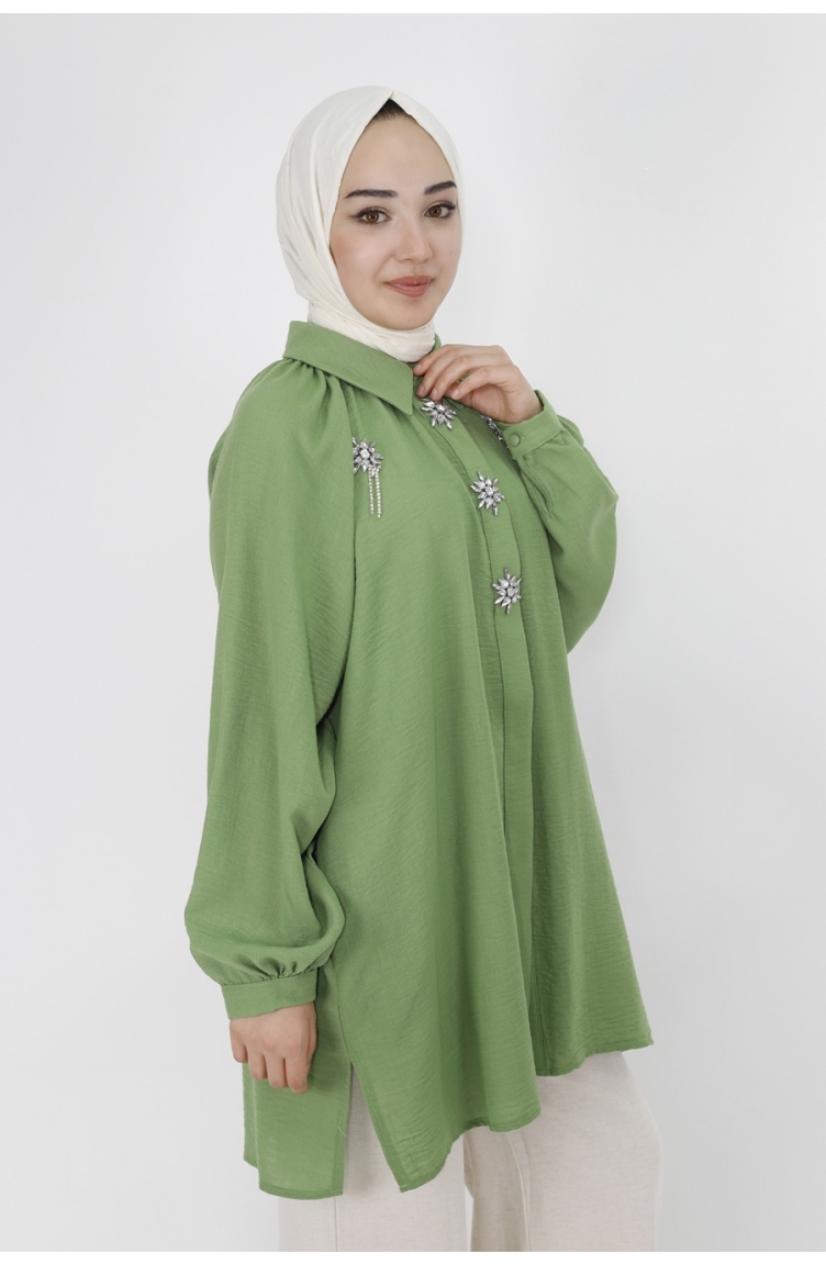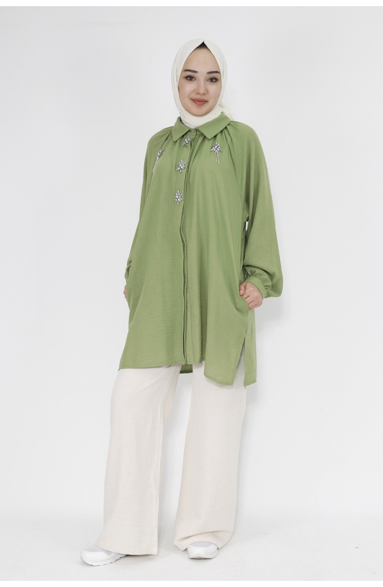 Puane Taşli Zincirli Keten Kumaş Tunik Gömlek 20540-03 Yeşil