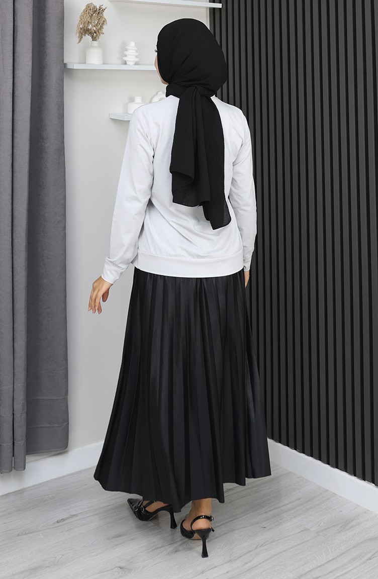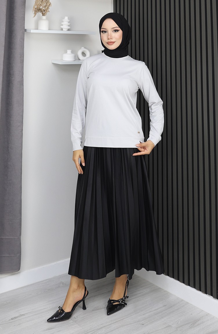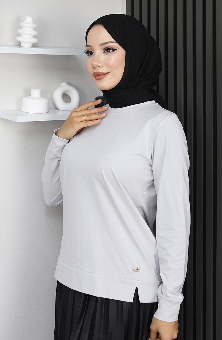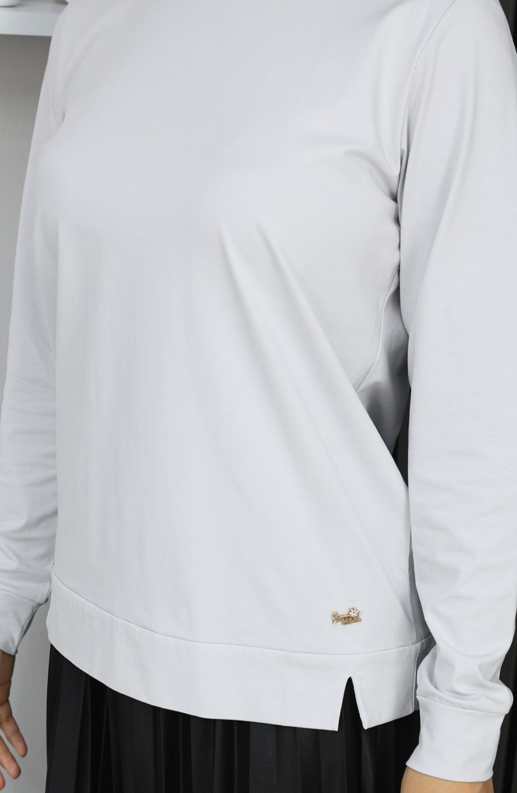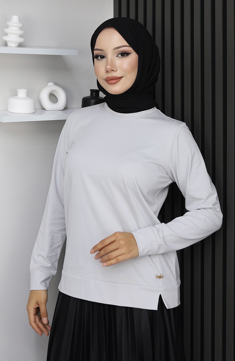 Yırtmaç Detaylı Penye Bluz 1064-01 Taş