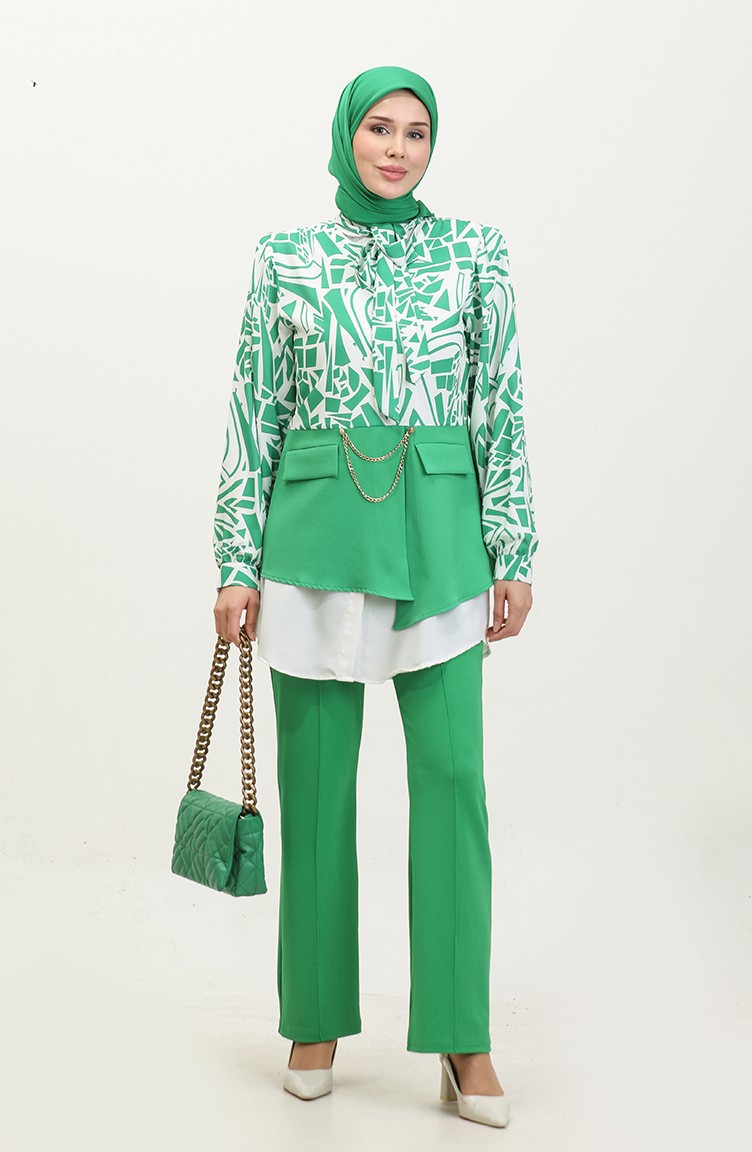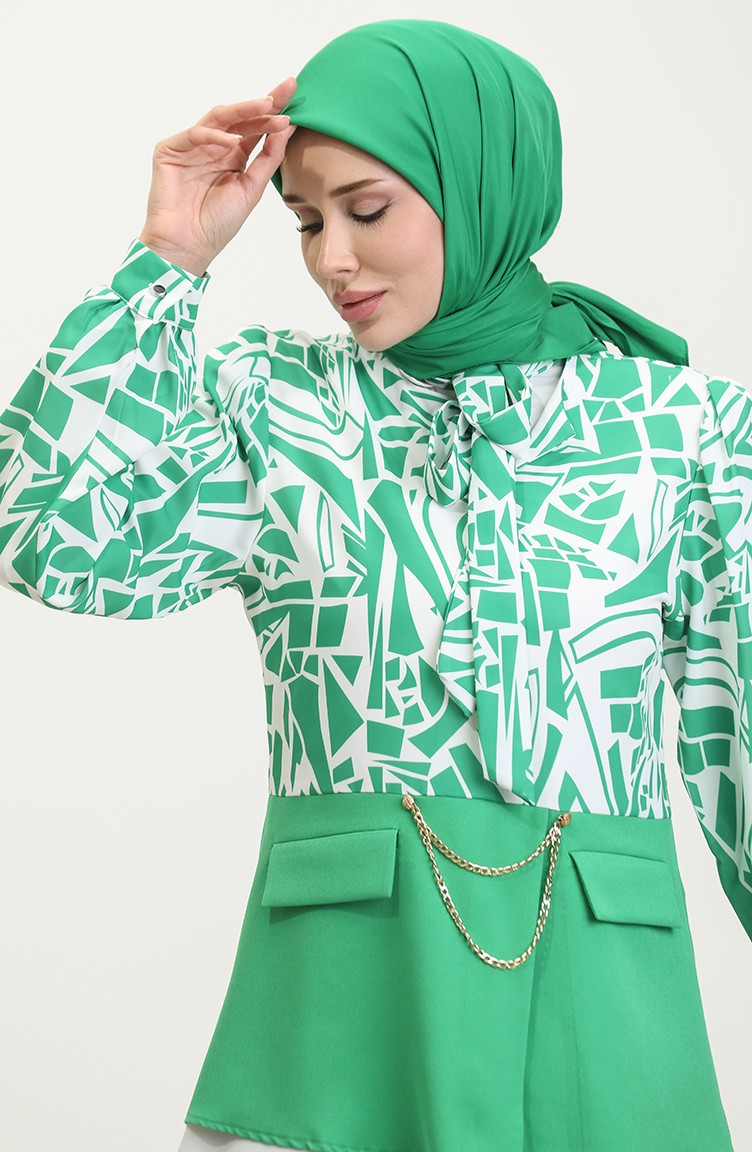 Zincir Detaylı Desenli Bluz Yeşil T1692