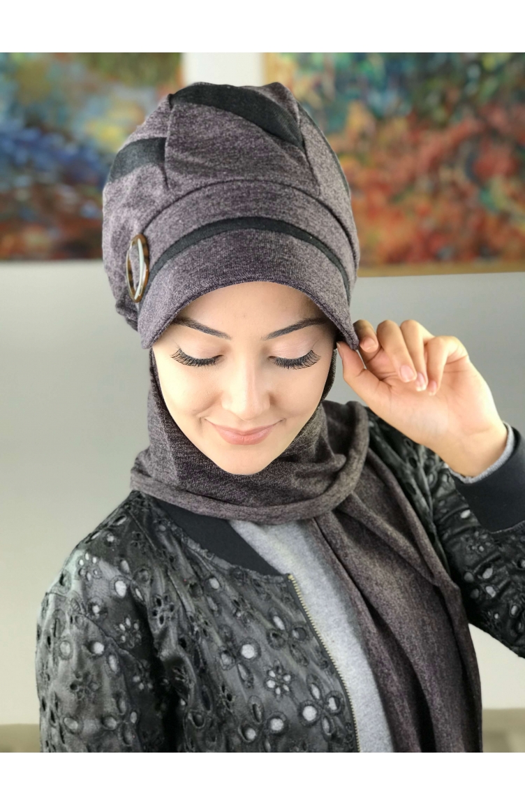 Çarkıfelek Model Tokalı Atkılı Şapka Türban 017AŞ12EKM-01 Orta Mor Siyah