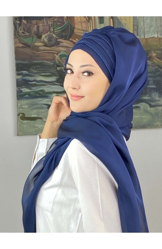 Topkapı Çapraz Drapeli Biritleri Simli Fransız Şifon Hazır Şal SBT4SAL30-11 Açık Lacivert